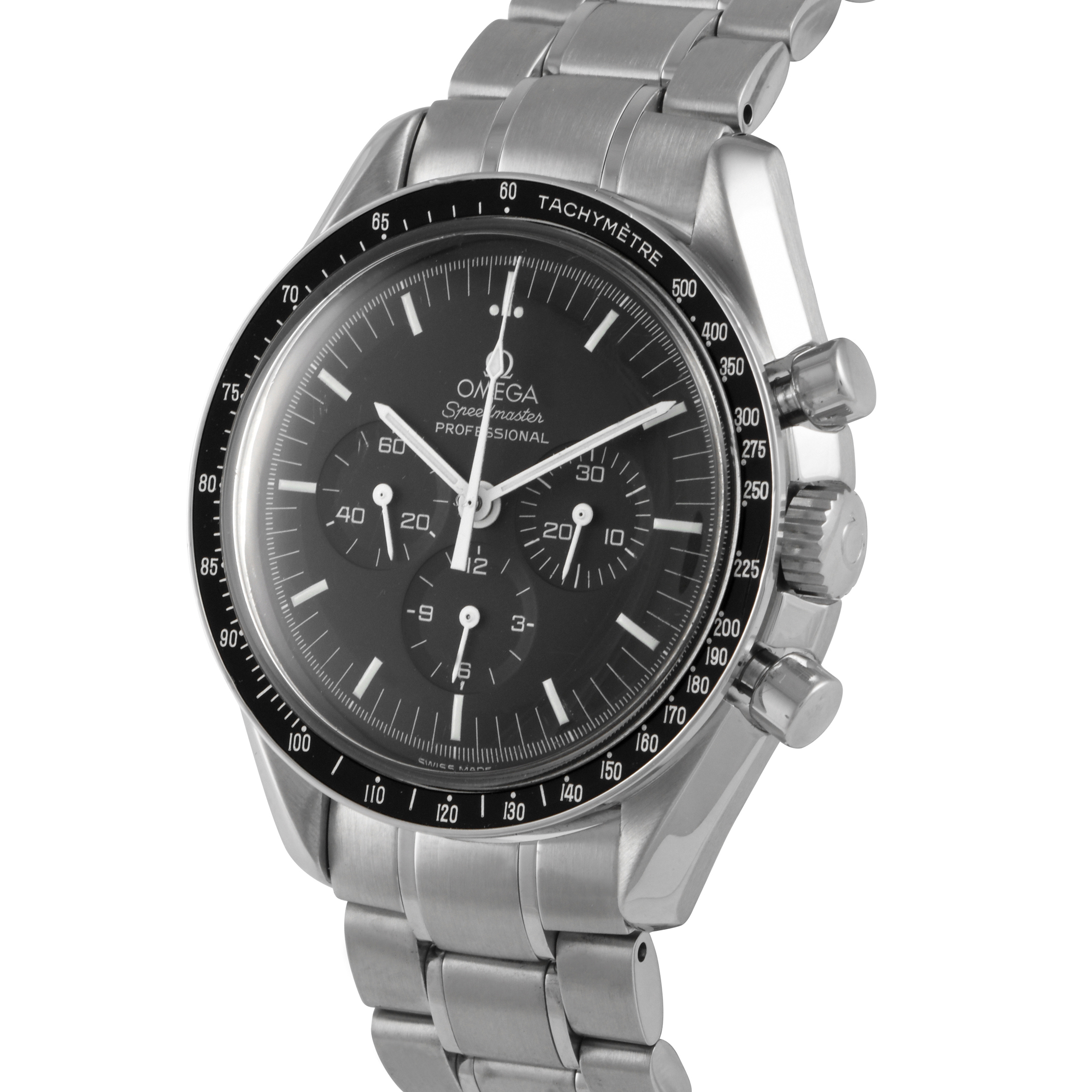 The ref.3572.50.00 is a discontinued Speedy model with a Hesalite crystal top and a sapphire case back. The watch comes with a steel-on-steel finish, with the case measuring 42mm in diameter and worn on a stainless steel bracelet. The dial is black with luminous white hour markers and hands. It is framed by a black bezel with a tachymeter scale. The watch is powered by a rhodium-finished OMEGA caliber 1863 hand-wound movement that offers a power reserve of 48 hours.