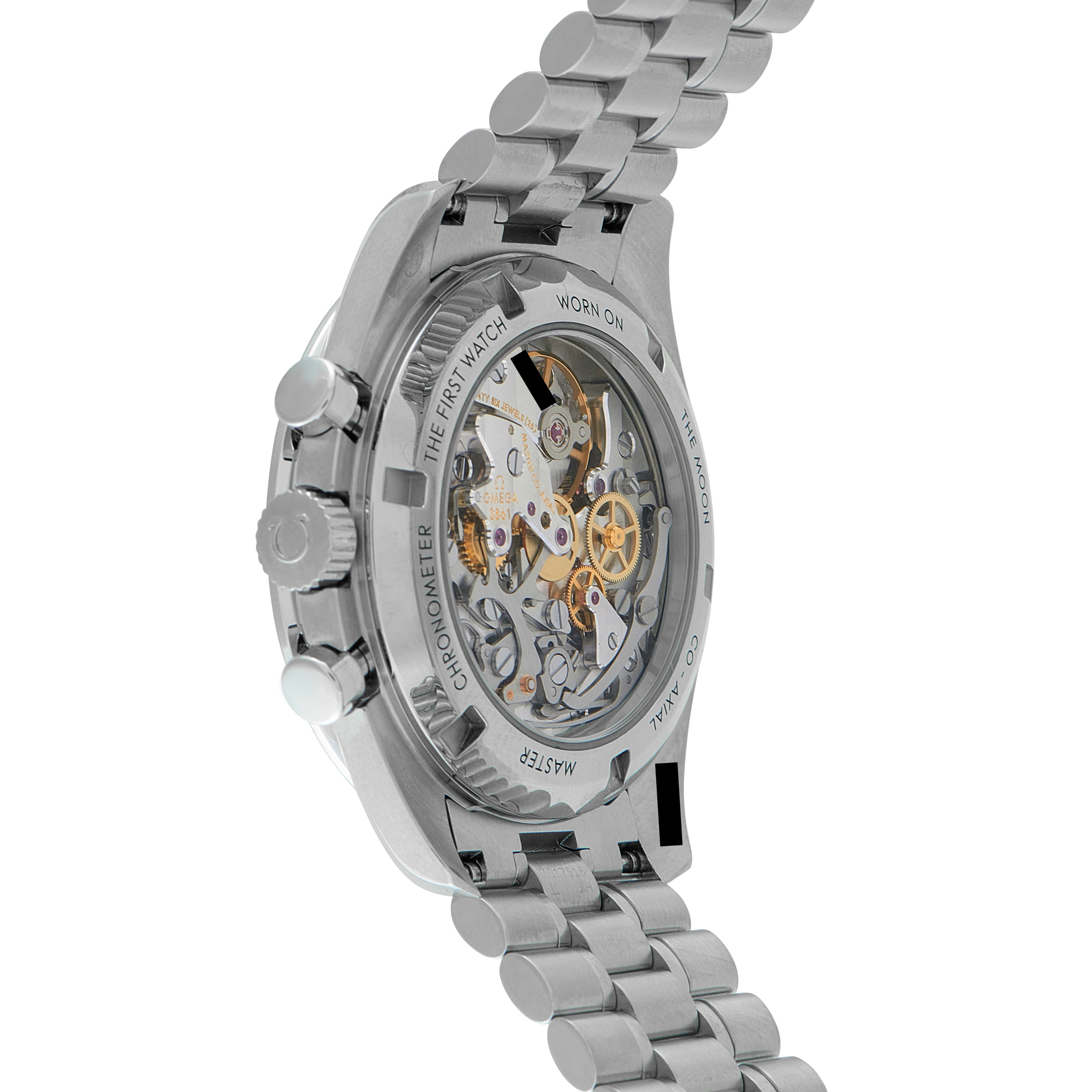 Known by enthusiasts as the “Sapphire Sandwich,” this Speedmaster Moonwatch features a scratch-resistant sapphire crystal on both the front and case back. You have a view of the manual-winding OMEGA Co-Axial Master Chronometer Calibre 3861 that powers the watch. It boasts a Master Chronometer certification guaranteeing superior precision, performance, and magnetic resistance up to 15,000 gauss. This Omega ref. 310.30.42.50.01.002 has a 42mm steel case on a matching steel bracelet, a black dial, and a black aluminum bezel insert with the famous dot over 90.
