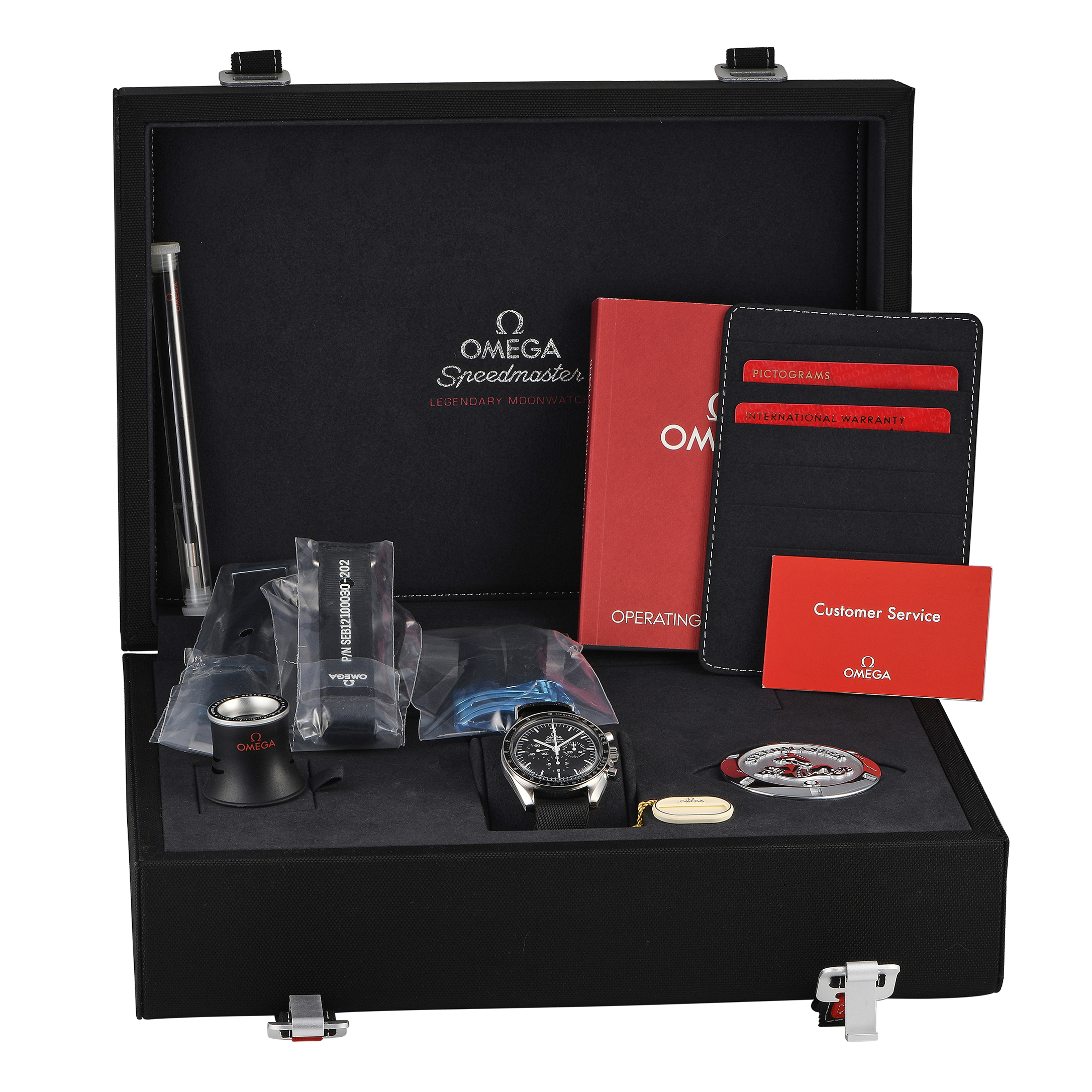 This pre-owned Omega Speedmaster Moonwatch Professional Watch 311.33.42.30.01.001 comes as a full set, complete with papers, an extra strap, a strap-changing tool, a loupe, the Speedmaster medallion, and the manufacturer’s box.
