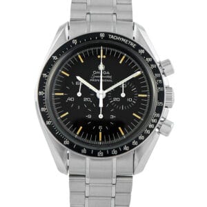 The transitional Moonwatch, the Omega Speedmaster ref. 145.022 marked the shift from the legendary Caliber 321 to the Caliber 861, a movement that would power Speedmasters for decades to come. Among its notable variants is the ref. 145.022-71, the first to feature the caseback engravings “Flight-Qualified by NASA for All Manned Space Missions” and “The First Watch Worn on the Moon.” Externally, this watch model maintains the classic 42mm twisted-lug case in steel, black stepped dial, and tritium lume. It runs on a manual-winding chronograph movement and is fitted with a steel bracelet.