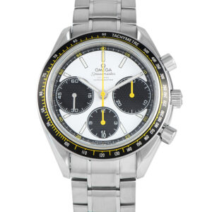 OMEGA’s Speedmaster Racing ref. 326.30.40.50.04.001 is a sporty chronograph with a wearable 40mm case and an eye-catching racing-inspired dial. Its white dial features a trio of black counters with a “Clous de Paris” pattern, a racing minute track on the outer perimeter, applied hour markers with luminous fill for visibility, and bright yellow accents for a high-contrast look. Encircling the watch’s face is a black aluminum bezel with a tachymeter scale. The watch is powered by the Co-Axial caliber 3330, a self-winding movement with 52 hours of power reserve.