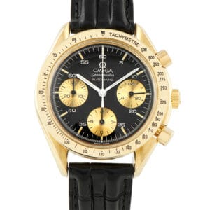 Papers and the manufacturer’s box accompany this pre-owned Omega Speedmaster Reduced 18K Yellow Gold Chronograph Watch 175.0033.