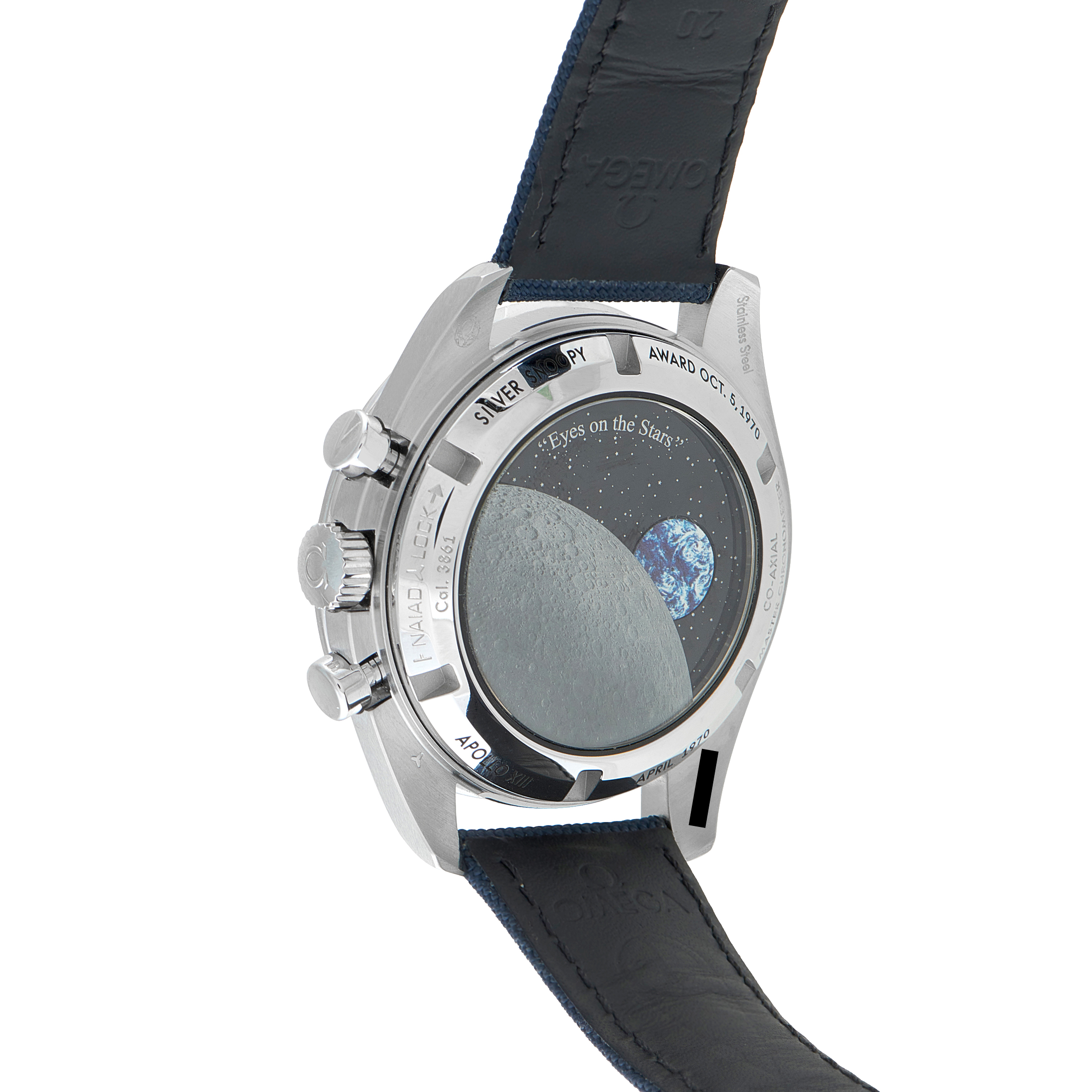 A tribute to space exploration, OMEGA’s Anniversary Series “Silver Snoopy Award” combines classic design with innovative features. It has a 42mm steel case, a ceramic bezel, and a silver-and-blue color scheme. The silver dial is detailed with crisp blue subdials, with Snoopy in the running-seconds register at 9, integrated as part of the layout rather than treated as decoration. The caseback reveals Snoopy in motion, orbiting the moon when the chronograph is used. Mechanically, the hand-wound Caliber 3861 modernizes the Moonwatch format through contemporary standards while preserving the familiar feel of daily winding.