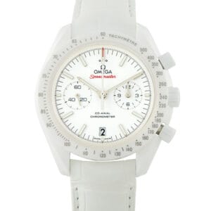 Machined from a single block of ceramic, this timepiece features a polished and brushed 44.25 mm case with a ceramic bezel featuring a matte chromium nitride tachymeter scale. A white alligator leather strap further elevates the design. On the white dial, you’ll find luminous index markers, luminous hands, white chronograph subdials, and a date dial located at the 3-o-clock position. It’s powered by an automatic Omega 9300 movement with 60 hours of power reserve time and is water resistant up to 50 meters.