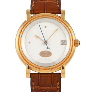 From Parmigiani Fleurier, here is the 36mm Toric Classic in 18K rose gold – an exquisitely finished and extremely elegant timepiece that’s hard to find. The watch boasts a knurled bezel, an impressive engine-tuned grain d’orge guilloche dial with a silver outer ring, and javelin-style hands. The seconds hand is in blued steel, providing an elegant contrast. At 3 o’clock is the date window, while at 9 and 12 o’clock are simple dot hour markers in rose gold. The watch is powered by the 25-jewel self-winding caliber 13301, which can be seen from the transparent case back.