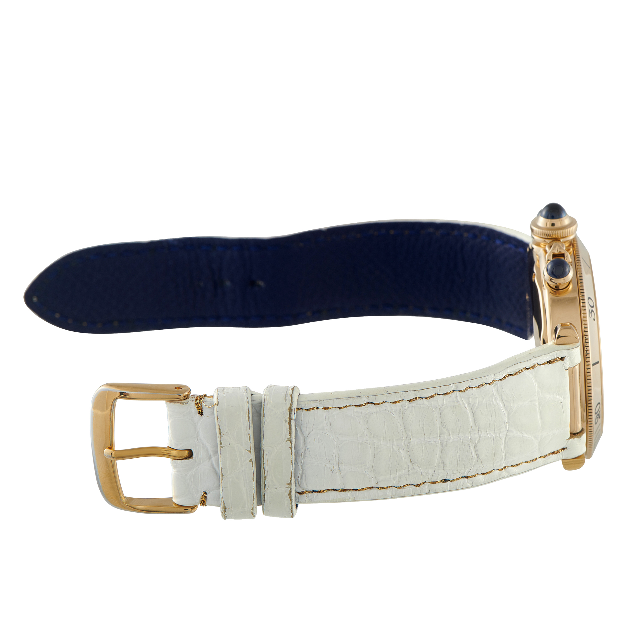 Ideal for everyday wear, this timepiece pairs a 38mm Yellow Gold case with a white leather strap. The silver dial comes complete with luminous blue toned hands, yellow gold toned index markers, a date dial located at the 3-o-clock position, and a trio of oval-shaped chronograph subdials for added elegance. At the side, you’ll also find a screw-down crown attached to the case by a small chain – a hallmark of this collection. It’s powered by a precise Quartz movement.