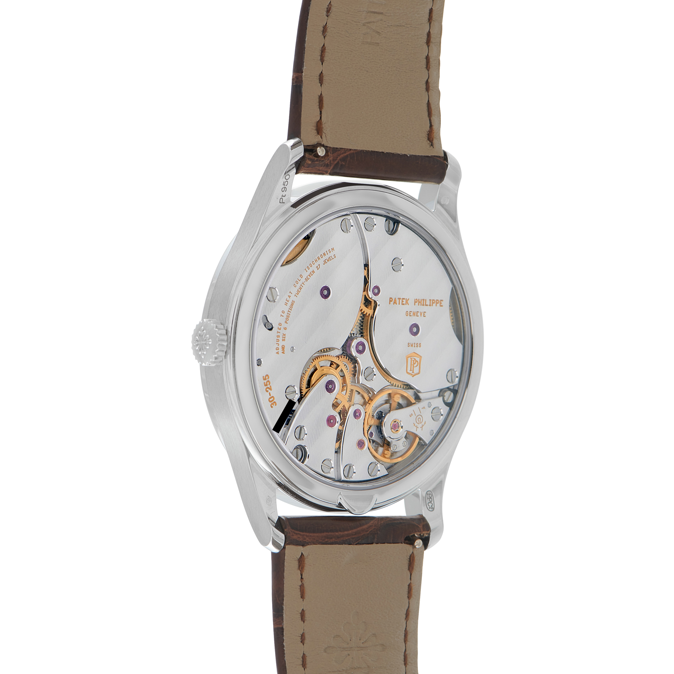 The Patek Philippe Calatrava 6196P-001 is a refined expression of understated elegance from the Calatrava collection. Crafted in 950 platinum, the watch features a 38 mm polished case with satin-finished flanks and a smooth, beveled bezel — topped off with the signature brilliant-cut diamond at 6 o’clock that marks platinum pieces.