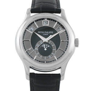 This pre-owned Patek Philippe Annual Calendar Moonphase 18K White Gold Watch 5205G is accompanied by a gift box.
