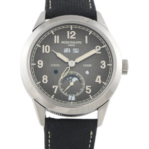 Made with the ability to simultaneously track the time both at home and away, this timepiece features a 41mm 18K White Gold case and a black leather strap. A vintage texture on the charcoal gray dial adds dimension to the classically elegant design. The dial comes complete with luminous syringe-shaped hands, Arabic numeral hour markers, a date display at the 6-o-clock position, a small seconds subdial, a date display, a month display, a day night indication for local and home times, and a moon phase feature. It’s powered by an ultra-precise Caliber 31-260 movement with a power reserve of up to 48 hours and is water resistant up to 30 meters.