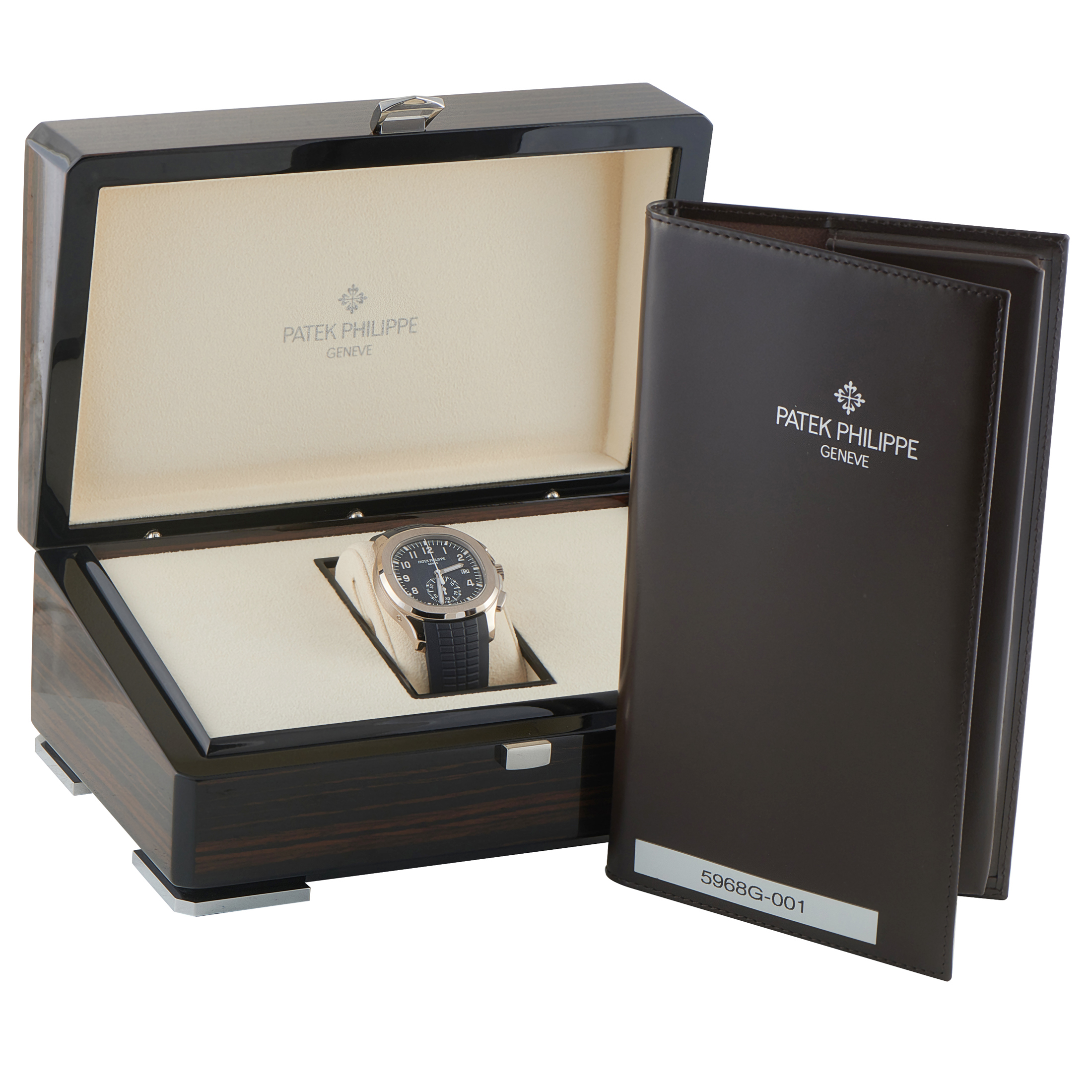 This pre-owned Patek Philippe Aquanaut Chronograph 18K White Gold Watch 5968G-001 comes with the original manufacturer’s presentation box, a leather bifold, and all associated paperwork.