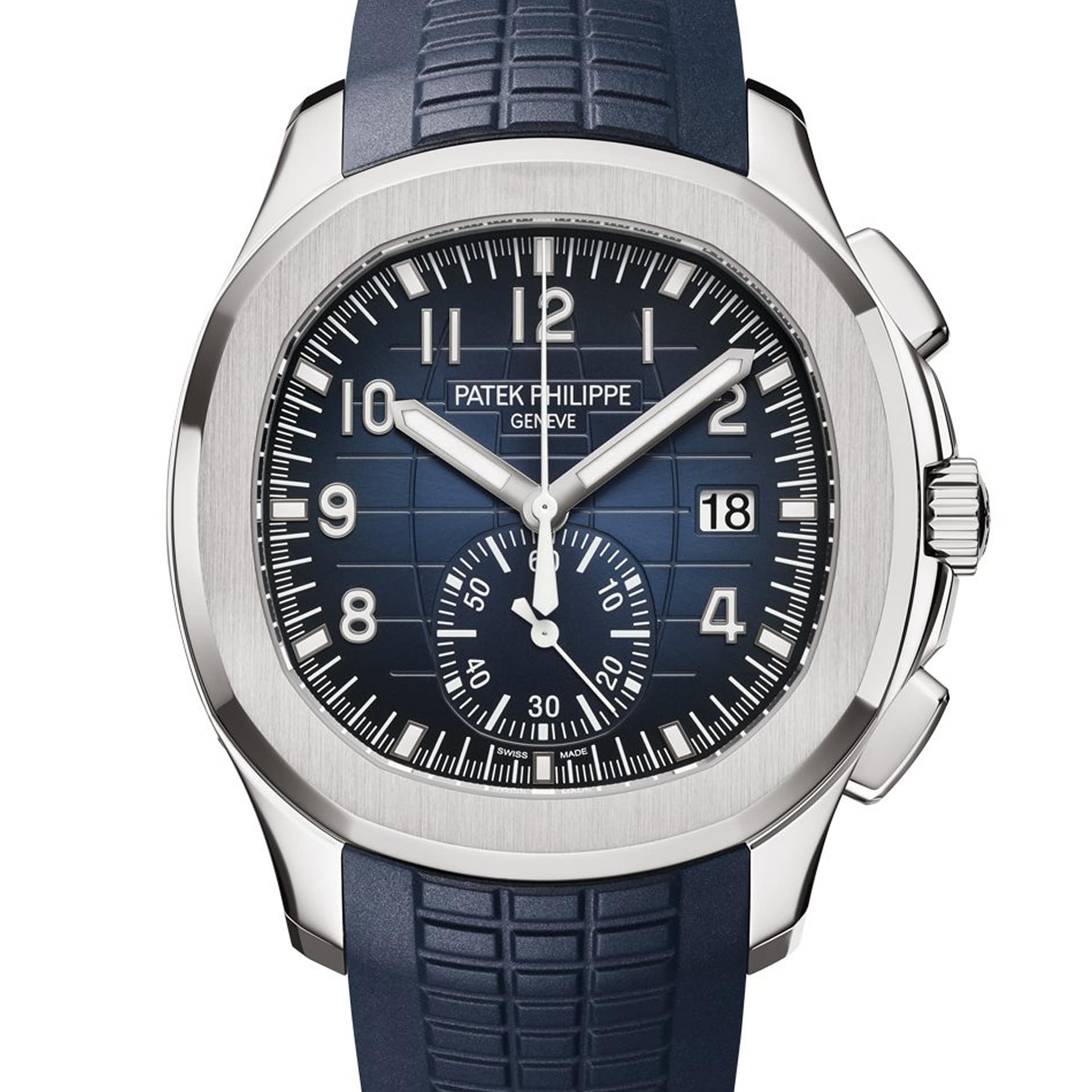 The 42.2mm case in 18k white gold features the collection’s signature rounded octagonal bezel, while the gradient blue dial, embossed with the customary Aquanaut pattern, darkens to black toward the edges.