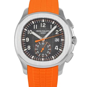 Introduced in 2018, the Patek Philippe 5968A-001 was the very first chronograph version of the Aquanaut. It brought a new level of sportiness to the collection while maintaining the distinctive design that defines the Aquanaut line. Crafted from stainless steel, the 42.2mm case features a mix of polished and satin-brushed surfaces along with the model’s signature rounded octagonal bezel — with the added duo of chronograph pushers flanking the winding crown. The black embossed dial is detailed with applied white gold numerals and bold orange accents for the chronograph functions.