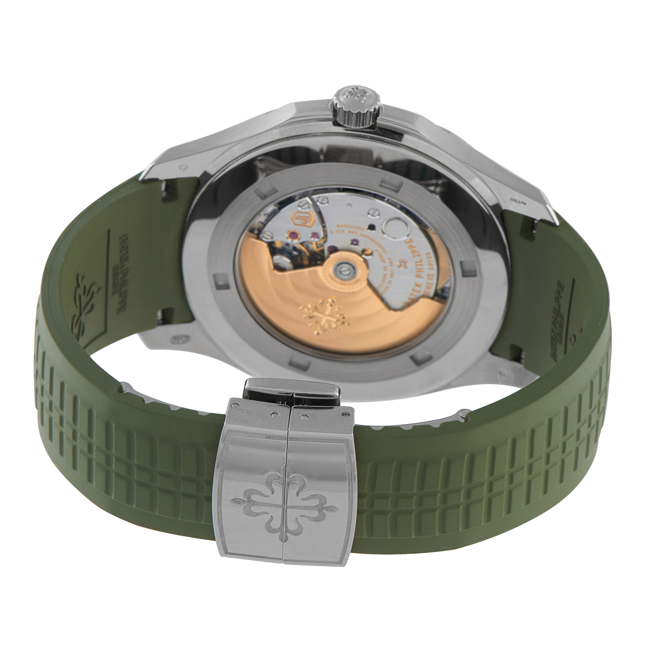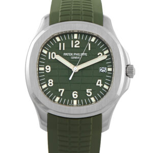 Sporty yet incredibly luxurious, this timepiece features a 42mm White Gold case and a green “Tropical” rubber strap with folding clasp closure. The strap complements the Khaki Green dial, which comes complete with White Gold Arabic numerals, luminous White Gold baton style hands, and date dial located at the 3-o-clock position – all set against the brand’s embossed Aquanaut pattern. It’s powered by an automatic 26-330 S C movement with 45 hours of power reserve and is water resistant up to 30 meters.