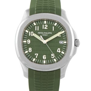 This is a pre-owned Patek Philippe Aquanaut “Jumbo” Khaki Green Dial 18K White Gold Watch 5168G-010. It is accompanied by papers and the manufacturer’s box.