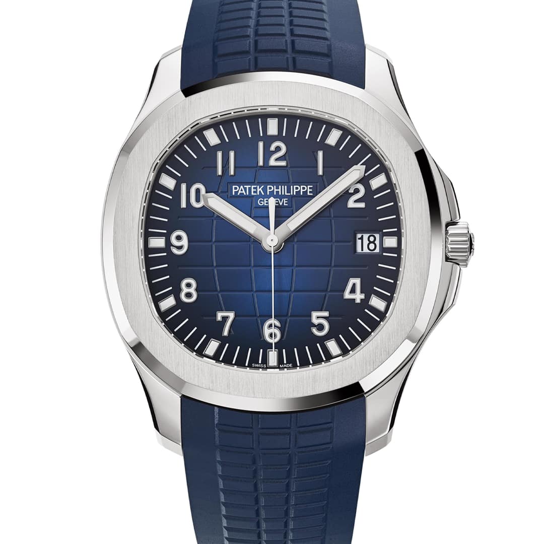 Introduced in 2017 to commemorate the 20th anniversary of the Aquanaut collection, the Patek Philippe Aquanaut 5168G-001 marked the debut of the “Jumbo” case size in 18k white gold. Inside the 42.2mm white gold case — topped, as always, with the characteristic rounded octagonal bezel — is a blue dial embossed with the collection’s distinctive pattern.