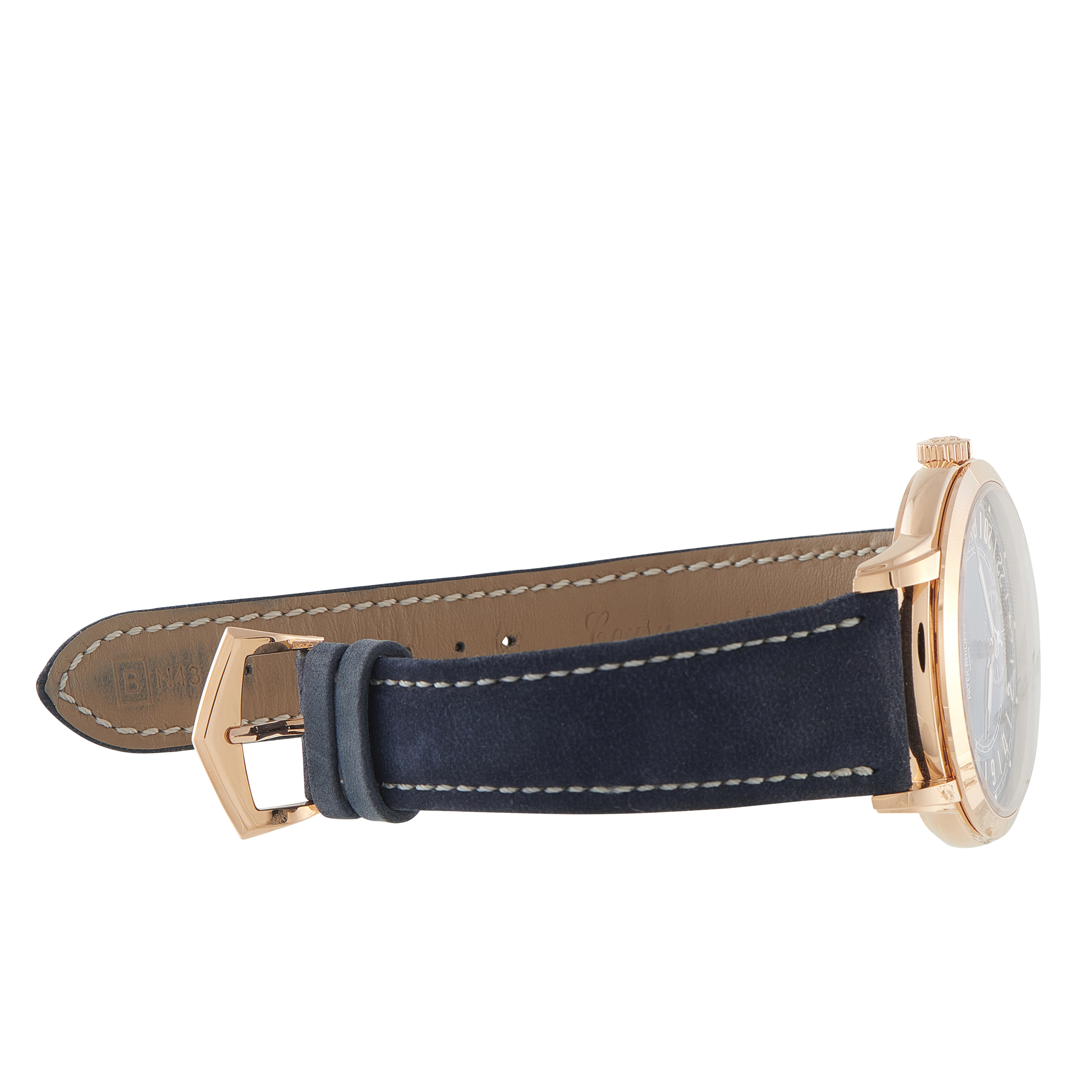 Long-distance travel reshapes how time is read. The rose gold Patek Philippe Calatrava ref. 5224R-001 answers with a full 24-hour dial, allowing local and home time to move across a single circular track. The 42mm case carries the familiar Calatrava profile, with a polished bezel, tapered lugs, and a navy blue dial marked by applied rose gold numerals, a railway minute track, and syringe hands. Timekeeping comes from the self-winding Caliber 31-260 PS FUS 24H, with the local hour hand advancing in one-hour steps through the crown.