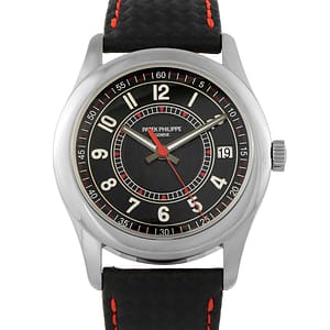 A watch meant for those who enjoy precision wrapped in a forward-looking aesthetic. The Patek Philippe Calatrava ref. 6007G-010 has a white gold case framing a charcoal dial marked by a carbon-pattern center, which creates a dynamic backdrop for the luminous hands and Arabic numeral hour markers. Red accents and clear linework bring a youthful, modern edge to the design. Beneath it all, the automatic Caliber 26-330 S C movement keeps time steadily and precisely. A black leather strap with carbon pattern and red stitching mirrors the dial’s aesthetic, bringing a cohesive harmony to the piece.