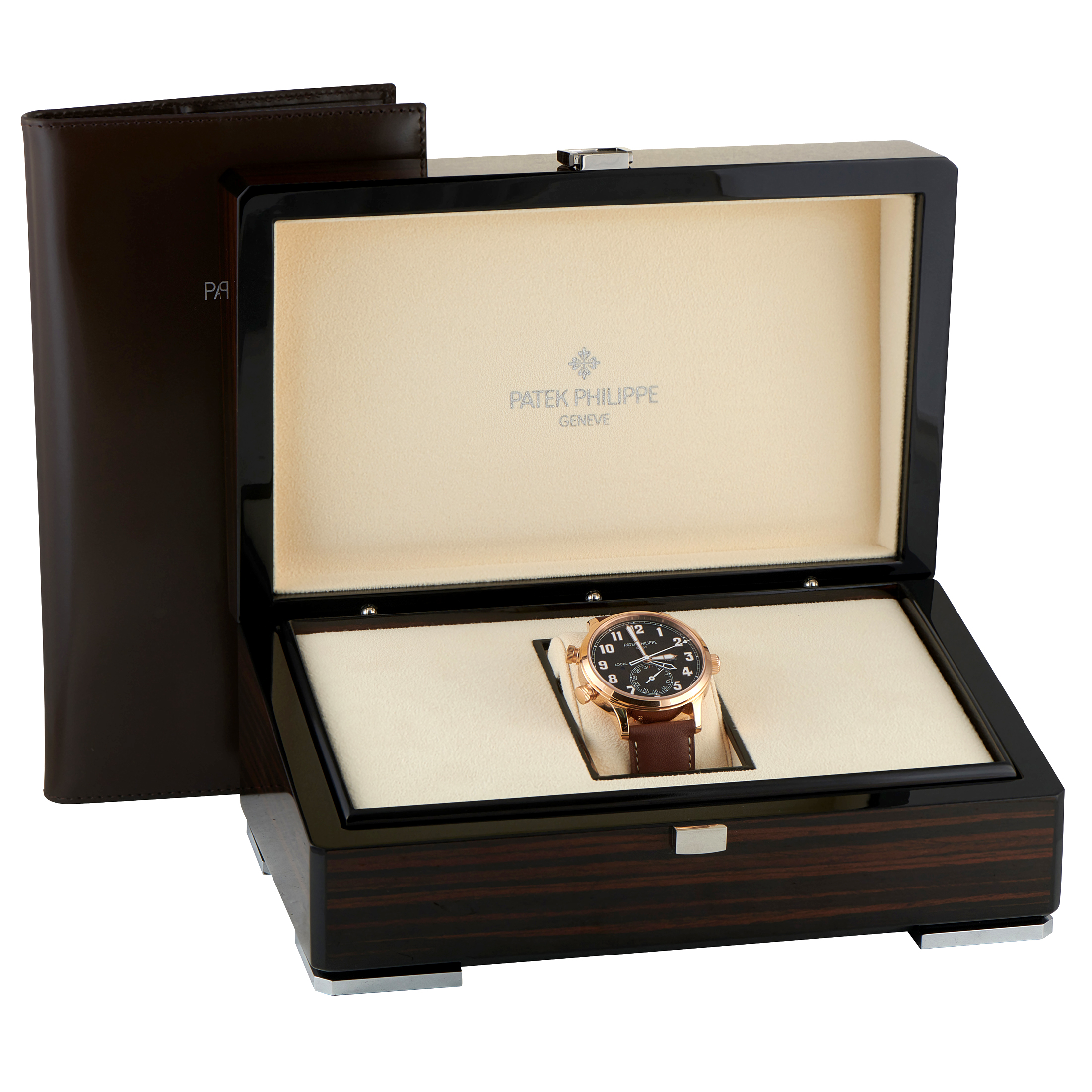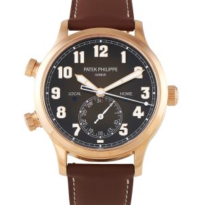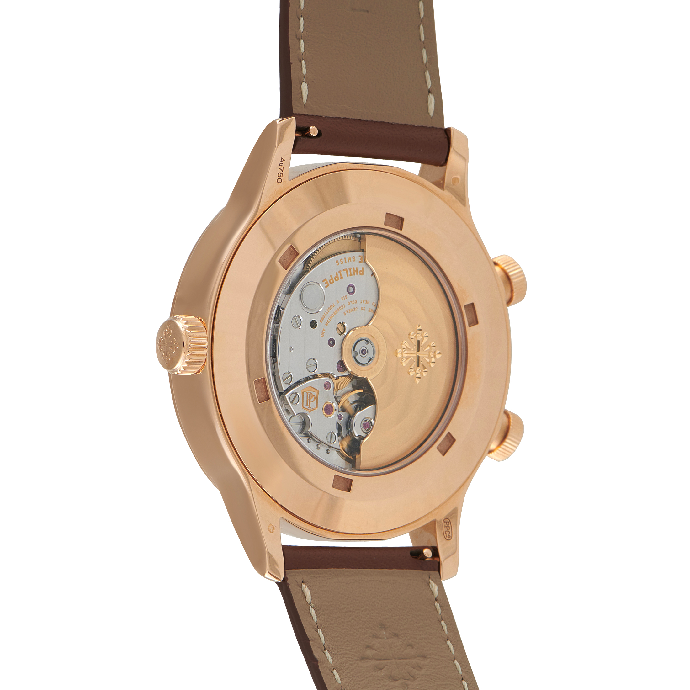 This is an unworn Patek Philippe Calatrava Pilot Travel Time Rose Gold Watch 5524R-001. It comes with papers and the manufacturer’s box.