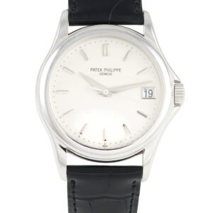 Launched in 2005 and in production until 2012, this white gold Calatrava undeniably exudes elegance and timeless appeal. Its 37mm-wide case with a smooth, domed bezel wears well on the wrist. The crisp and clean opaline white dial is neatly detailed with applied faceted baton markers, silver-toned hands, and a date window at 3 o’clock.