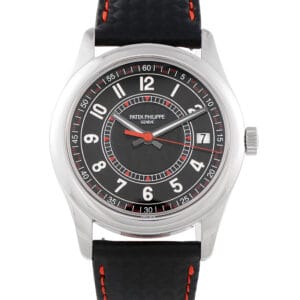 Unlike the classic Calatravas known for minimalist dials and a formal aesthetic, this ref. 6007G-010 adopts a bolder, more contemporary and sporty design. Its ebony black dial features an embossed carbon-fiber-like pattern, giving the watch an industrial feel. The dial also has a three-part finish, with a sunburst outer ring that carries the seconds track, a circular satin hour chapter ring, and an embossed center framed by a minute scale. Red accents on the dial and the stitching of the leather strap bring just enough color to highlight the watch’s technical character. A transparent case back reveals the automatic caliber 26-330 S C in full detail.