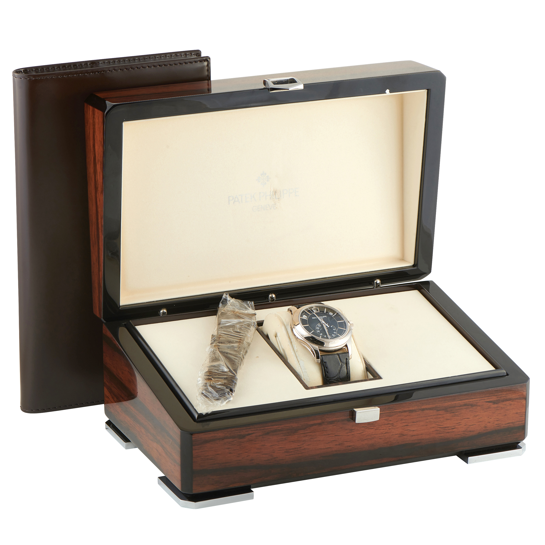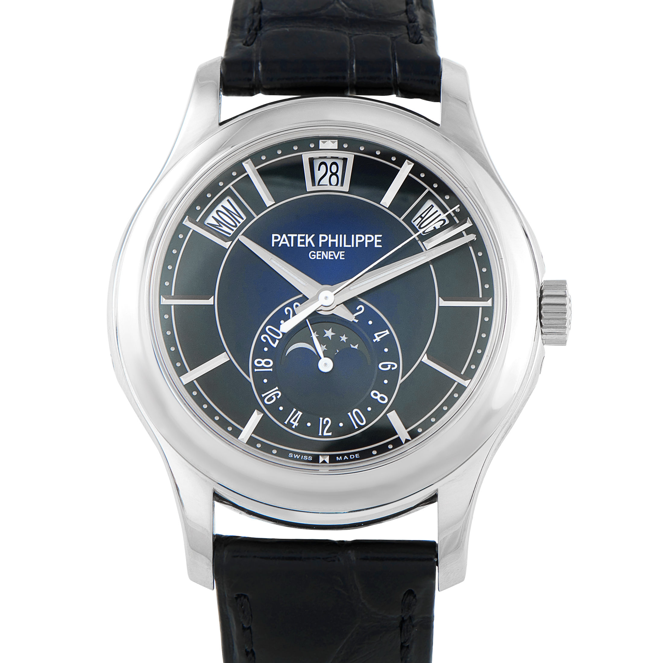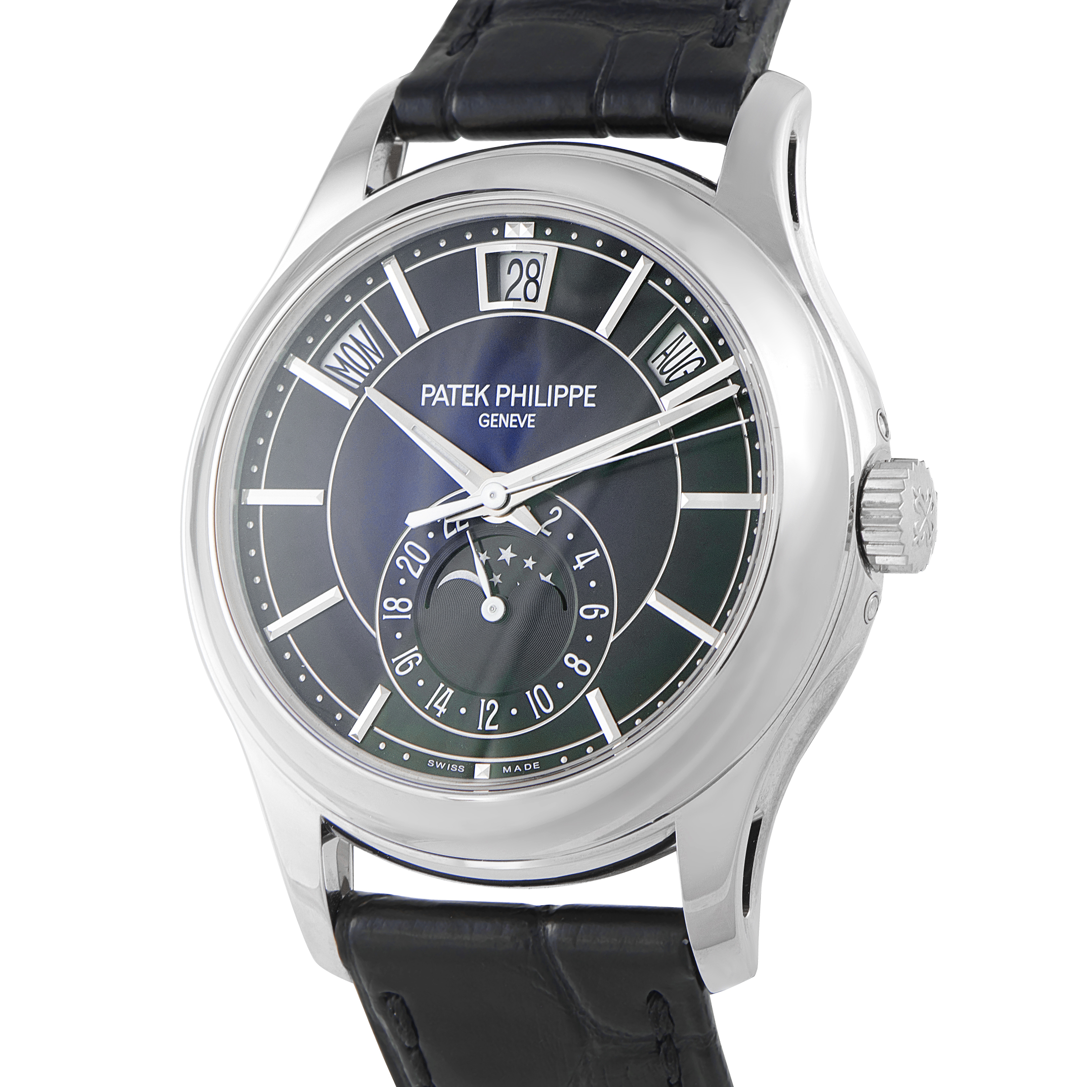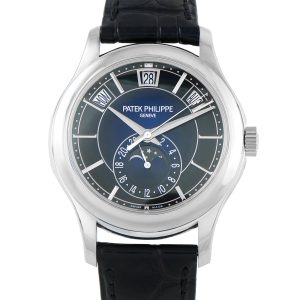 This is a pre-owned Patek Philippe Annual Calendar Moon Phase 18K White Gold Watch 5205G-013. It comes complete with papers, extra strap, a leather bifold wallet, and the manufacturer’s wooden presentation box.