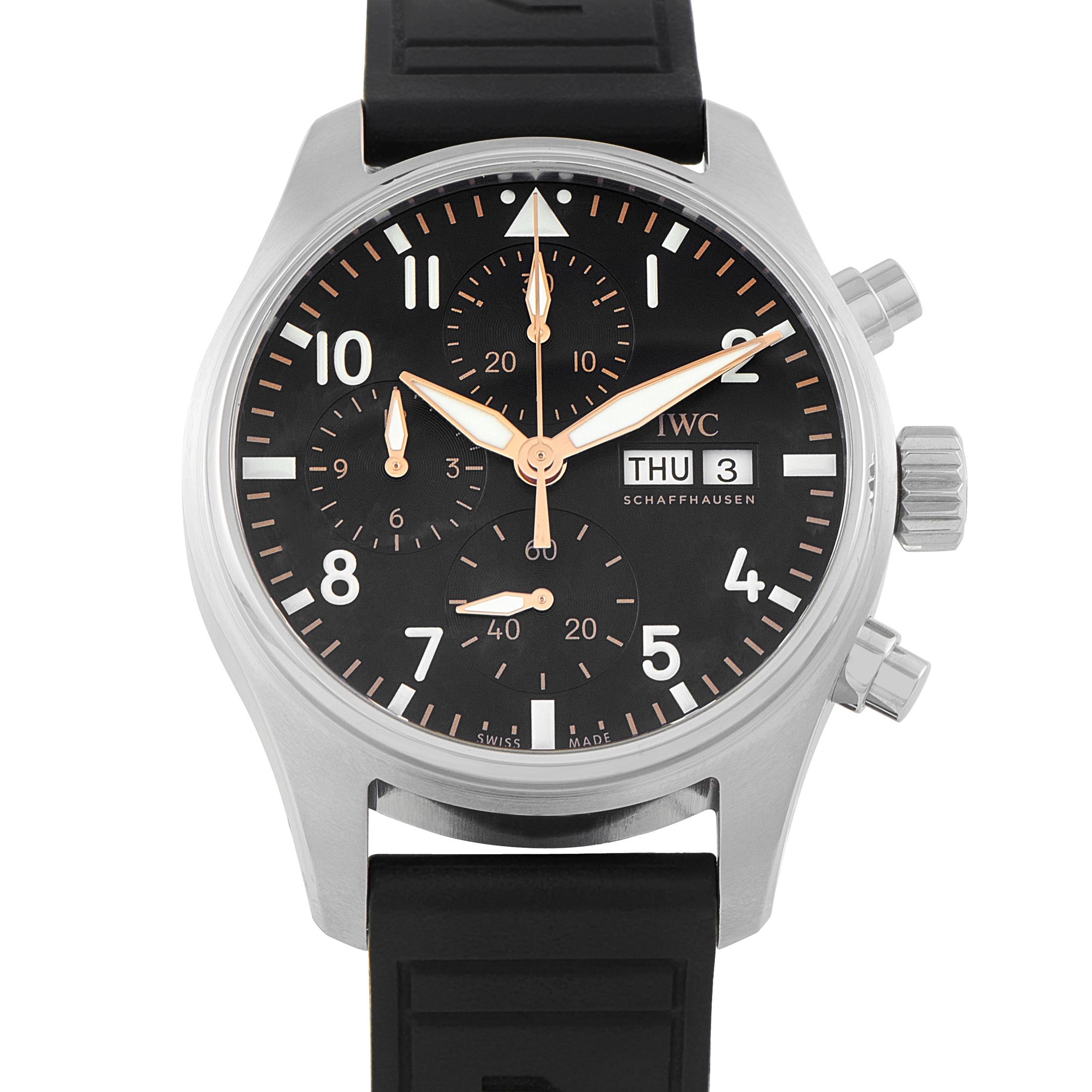 This pre-owned Patek Philippe 5070 18K Rose Gold Chronograph Watch 5070R-001 is accompanied by papers and the manufacturer’s box.
