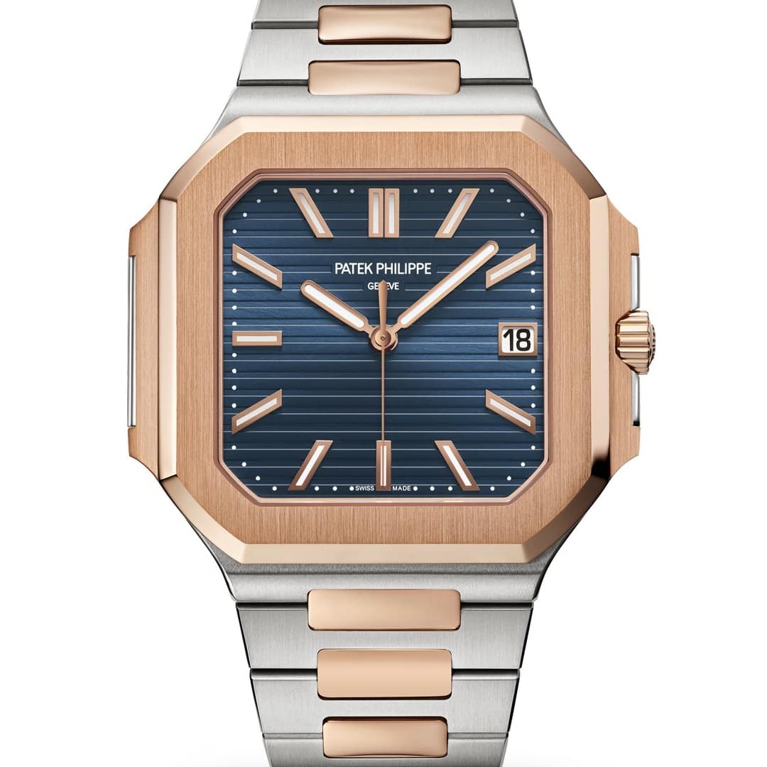 The Patek Philippe Cubitus 5821/1AR-001 elegantly combines stainless steel and 18k rose gold in a distinctive square case with rounded edges, measuring 45 mm in diameter and a slim profile of 8.3 mm.
