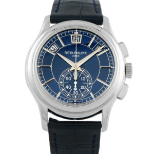 The Patek Philippe ref. 5905P-001 is prized by collectors for its mix of utility, luxury, and contemporary aesthetics. Its 42mm case is made from elegant platinum and complemented by a deep blue dial adorned with white gold baton hour markers. The annual calendar indicators are displayed in three arc-shaped apertures on the top half of the dial, while the 60-minute counter sub-dial with day/night indicator is at the bottom half. The watch is driven by the in-house self-winding Caliber CH 28-520 QA 24H movement and is worn on a dark blue leather strap.