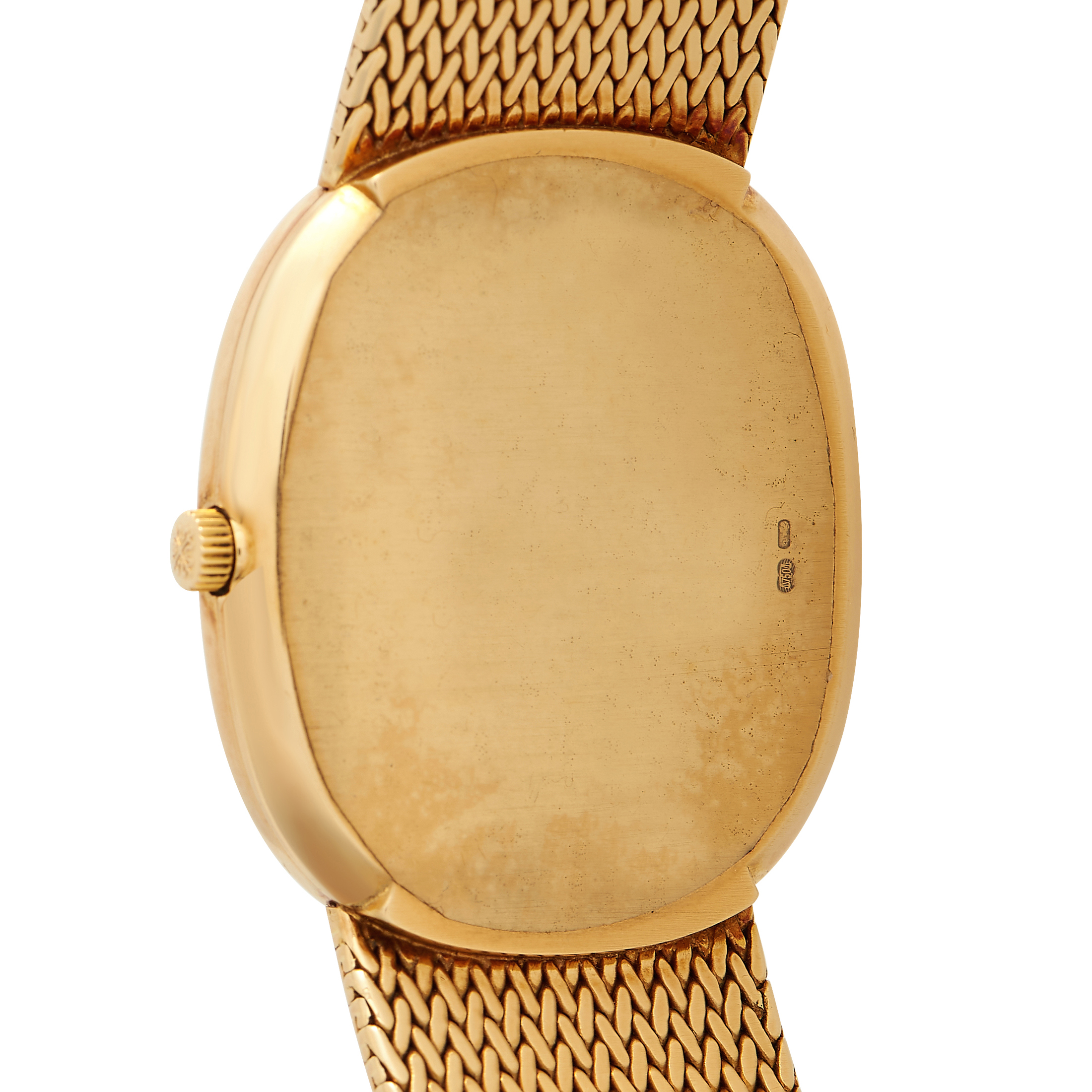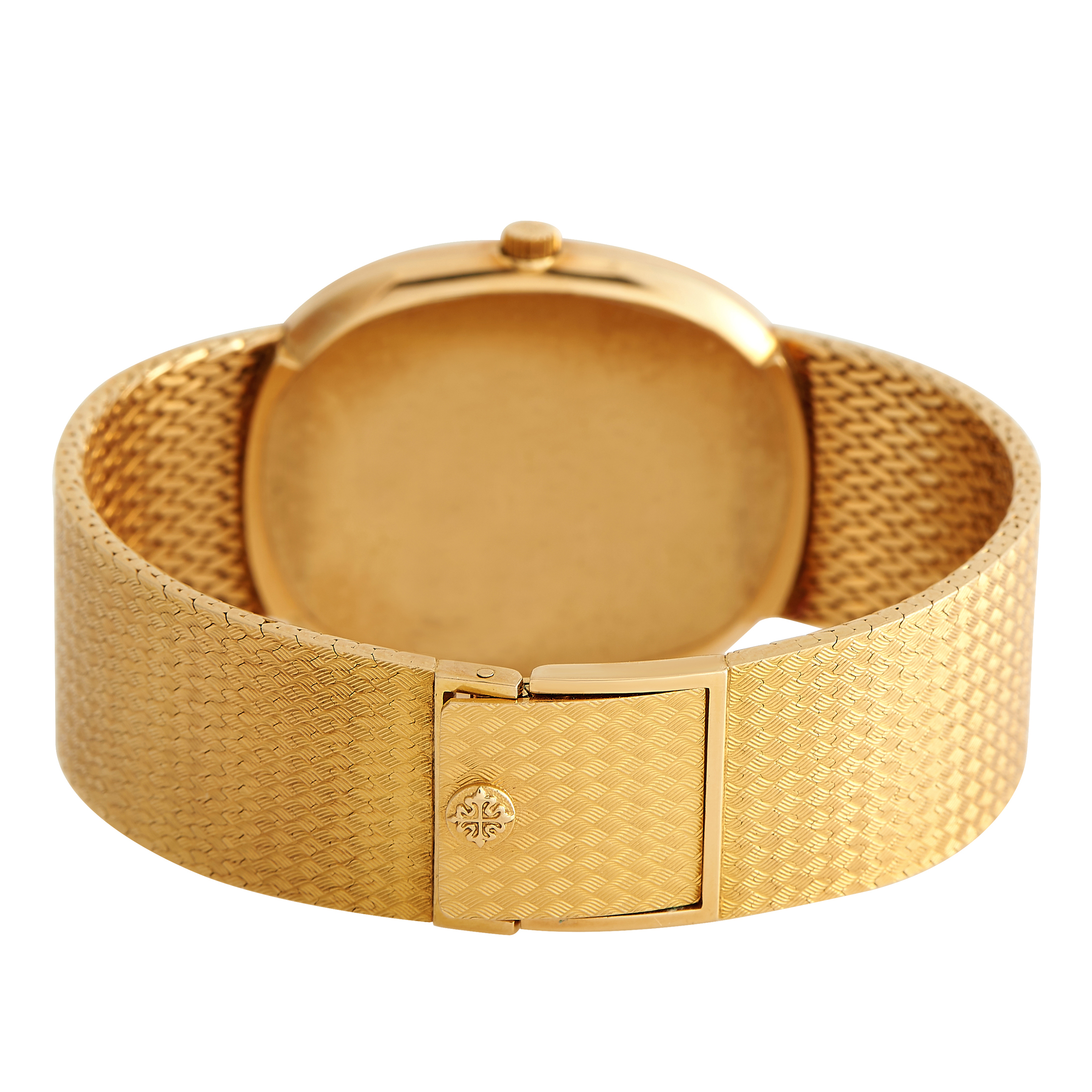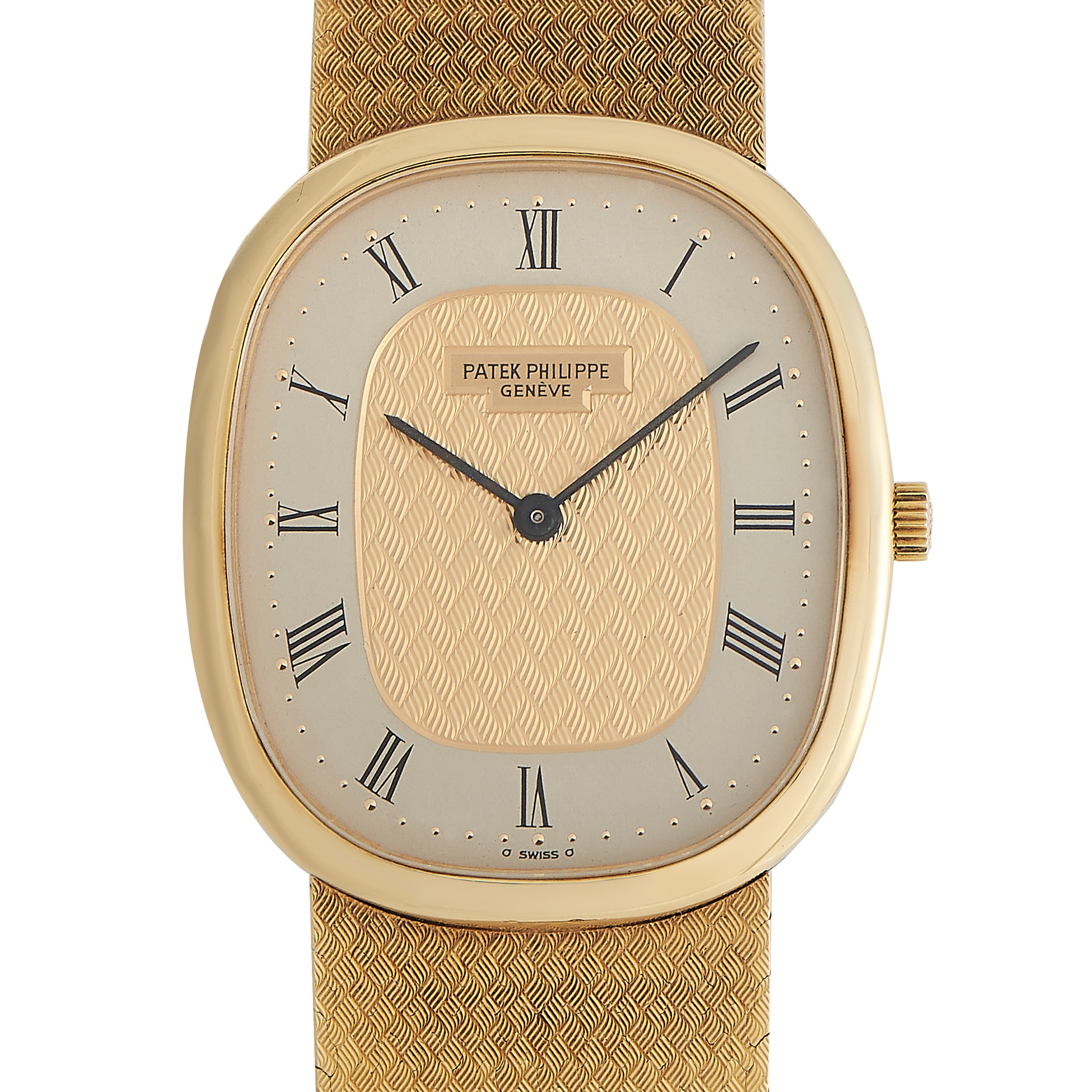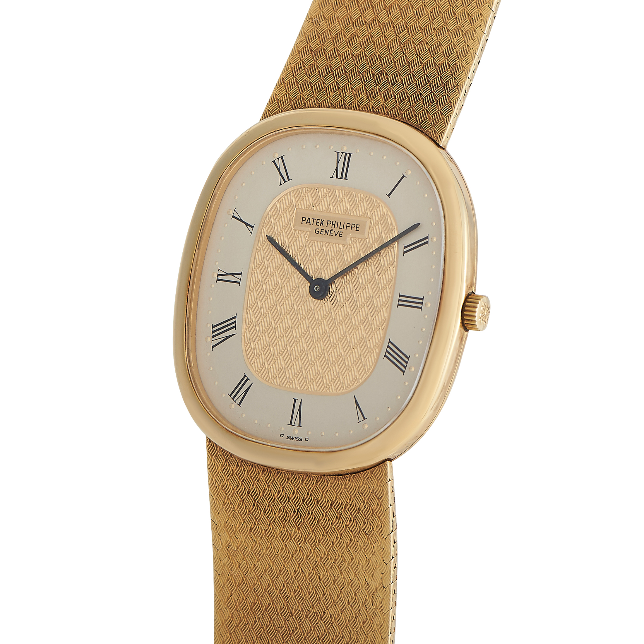 Presenting, this rare and attractive lug-less Patek Philippe Golden Ellipse. Fully clad in 18K yellow gold, this vintage quartz Patek ref. 3838 features an elliptical case fitted with a textured mesh bracelet. The two-toned dial bears a textured yellow gold center framed by a light gray chapter ring with black Roman numerals and gold dot minute markers. Slender hour and minute hands tell the time.