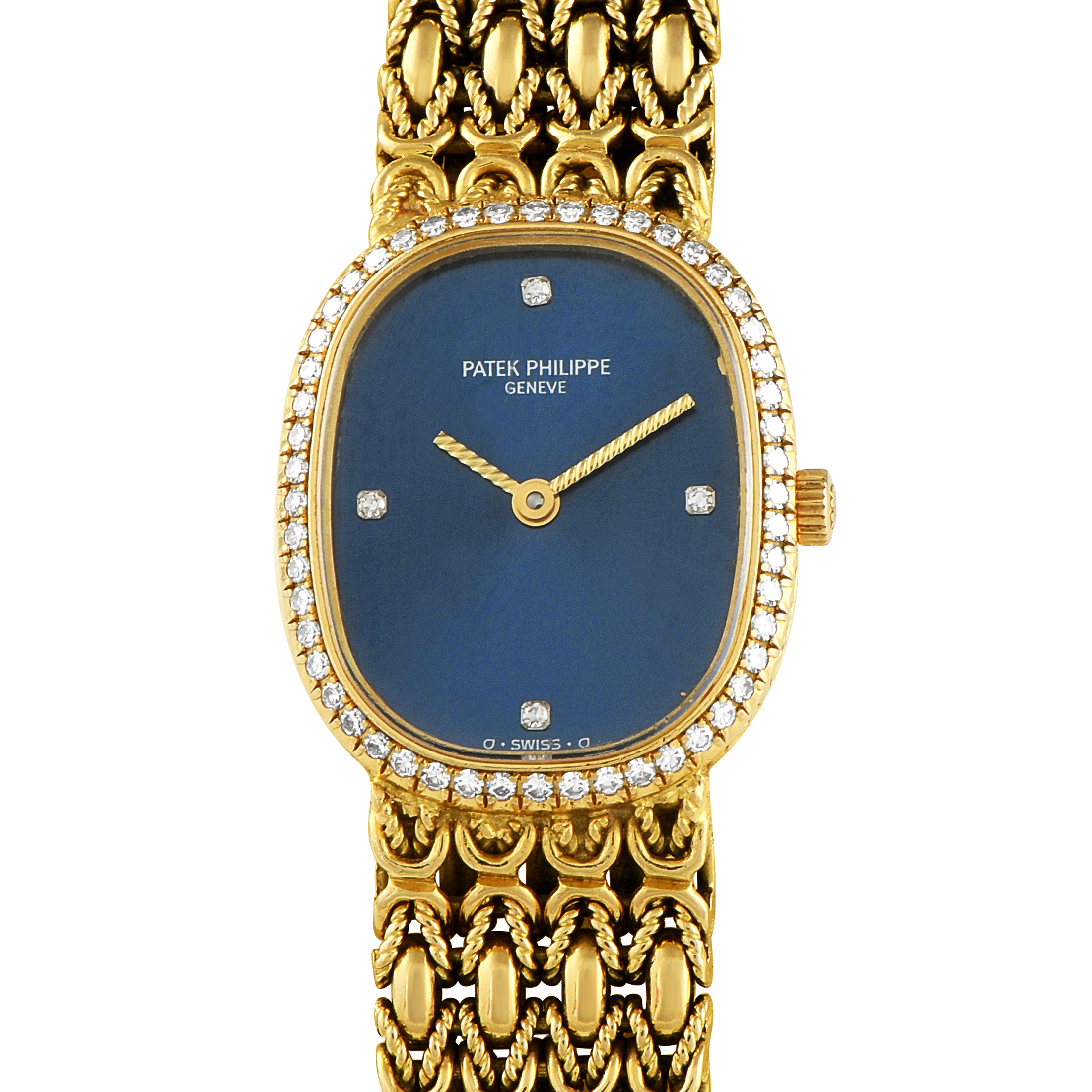 Patek Philippe’s Golden Ellipse Lady comes in full 18K yellow gold, yet it isn’t a loud watch. It offers a graceful presence with its 20mm oval case, diamond-set bezel, and elegant bracelet with a woven link pattern. It has a deep blue sunburst dial with no numerals, only a pair of rope-textured hands and four diamond quarter-hour markers. This model is equipped with the 6-jewel caliber E15 quartz movement.