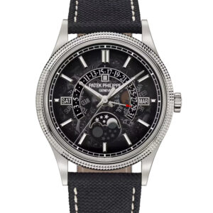 The Patek Philippe 6159G-001 reimagines the perpetual calendar in a contemporary and technically refined format. Housed in an 18 k white gold case measuring 39.5 mm in diameter (11.49 mm thick), it pairs the brand’s signature craftsmanship with modern design cues.