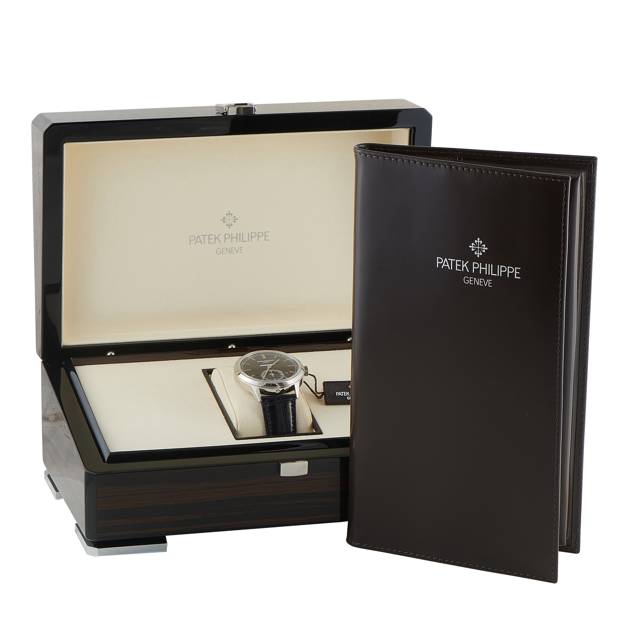 Papers and the manufacturer’s box accompany this Patek Philippe In-Line Perpetual Calendar Platinum watch 5236P.