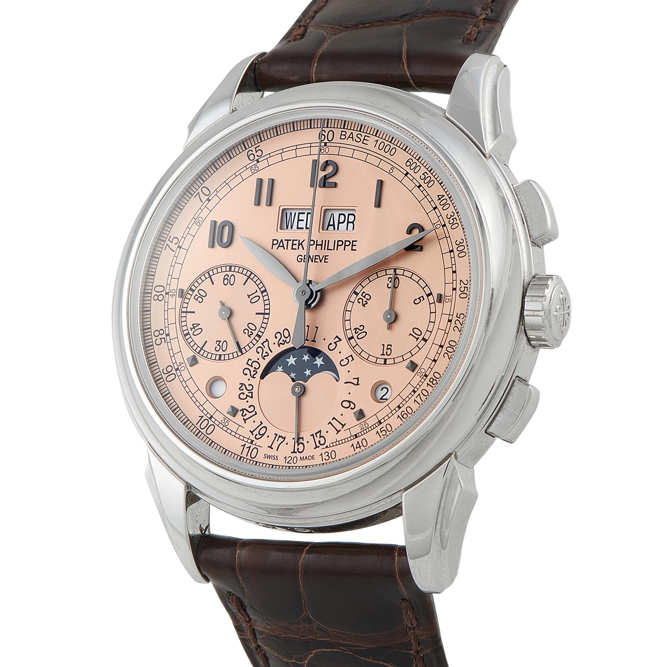 Platinum. Perpetual. Permanent. This platinum timepiece is a calendar for a lifetime, a chronograph for measured milestones. Distinguished by its salmon dial and blackened gold Arabic numerals, the ref. 5270P-001 honors a lineage dating back to 1941. At 41mm, the case carries weight in the hand and on the wrist. The bezel is thin, and the flanks are polished. A single diamond set between the lugs at six confirms the metal.