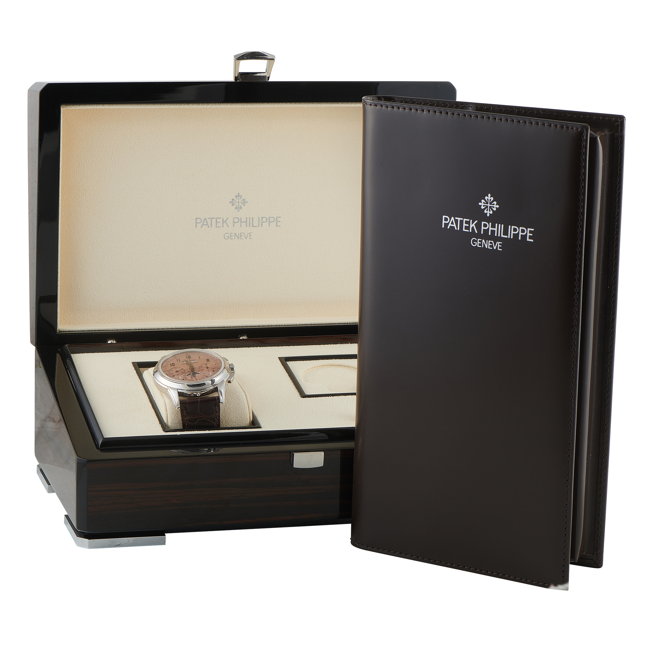 This is a pre-owned Patek Philippe Perpetual Calendar Chronograph Platinum Watch 5270P-001. It comes with papers, a leather bifold, and the manufacturer’s box.