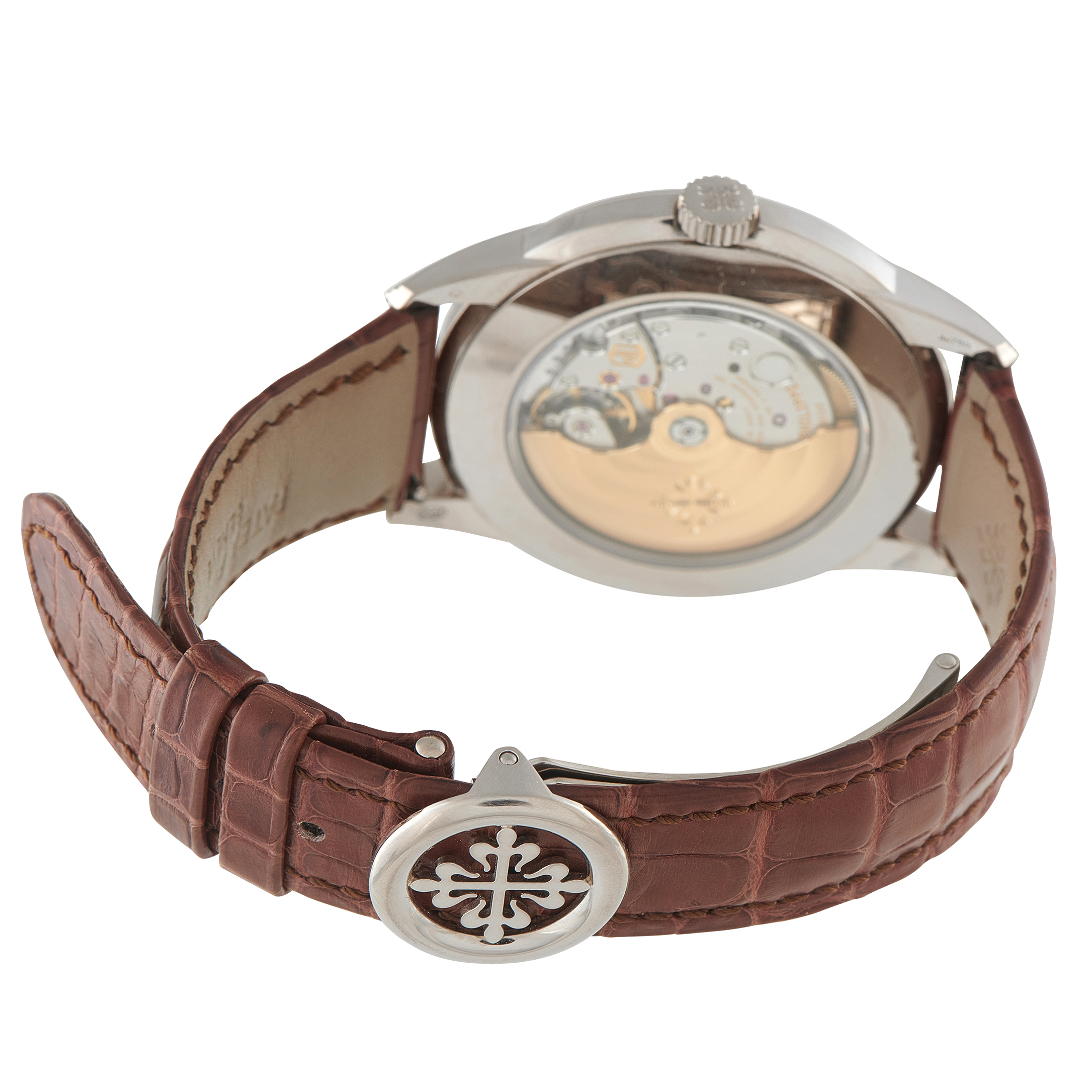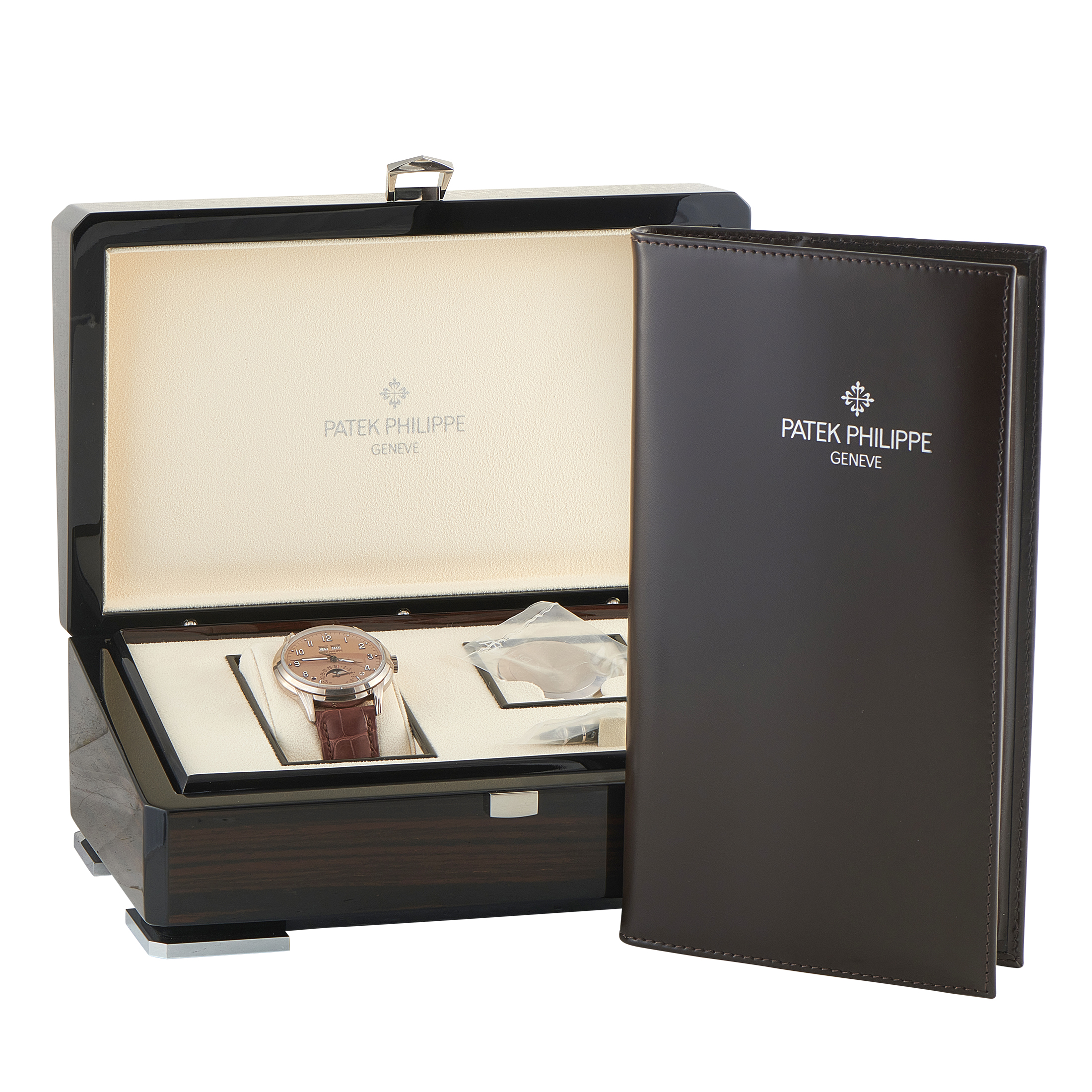 This is a pre-owned Patek Philippe Grand Complications Perpetual Calendar Salmon Dial White Gold Watch 5320G-011. It is accompanied by papers, a leather booklet, a setting pin, the interchangeable solid case back, and the manufacturer’s display box.
