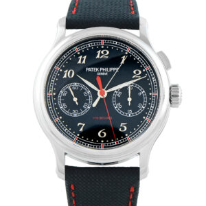 The Patek Philippe ref. 5470P-001 sets its technical prowess against a canvas of blue varnish, white gold Breguet hands, and elegant leaf-shaped hands. In addition to the normal white gold chronograph seconds hand, the 5470P has a red chronograph hand that spins around the dial every 12 seconds, clearly indicating tenths-of-a-second. This seemingly simple addition is an incredible horological feat. A 30-minute counter at 3 o’clock and a small seconds sub-dial at 9 complete the display.