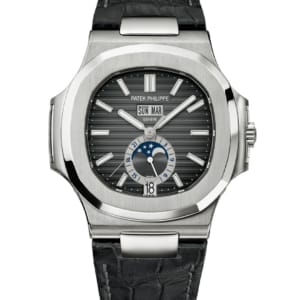 Released in 2010, the Patek Philippe Nautilus Annual Calendar Moonphase ref. 5726A-001 is one of the few Nautilus watches paired with a black alligator leather strap rather than an integrated bracelet. This detail gives the watch a dressier feel while still retaining the sporty spirit of the Nautilus collection. The 40.5mm stainless steel case features the characteristic porthole-shaped case with “ears” on the side and a rounded octagonal bezel on top.