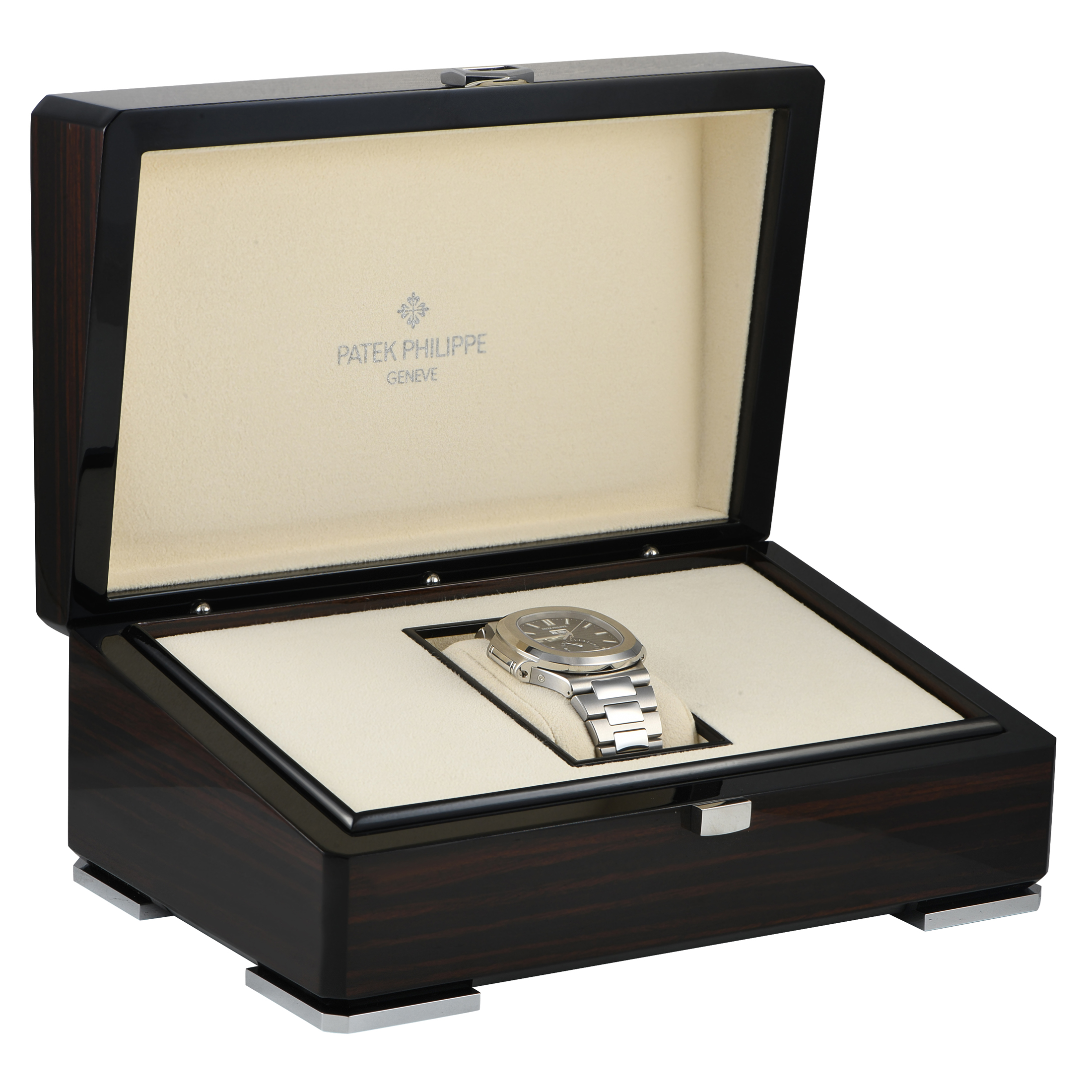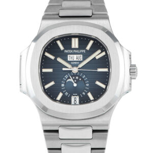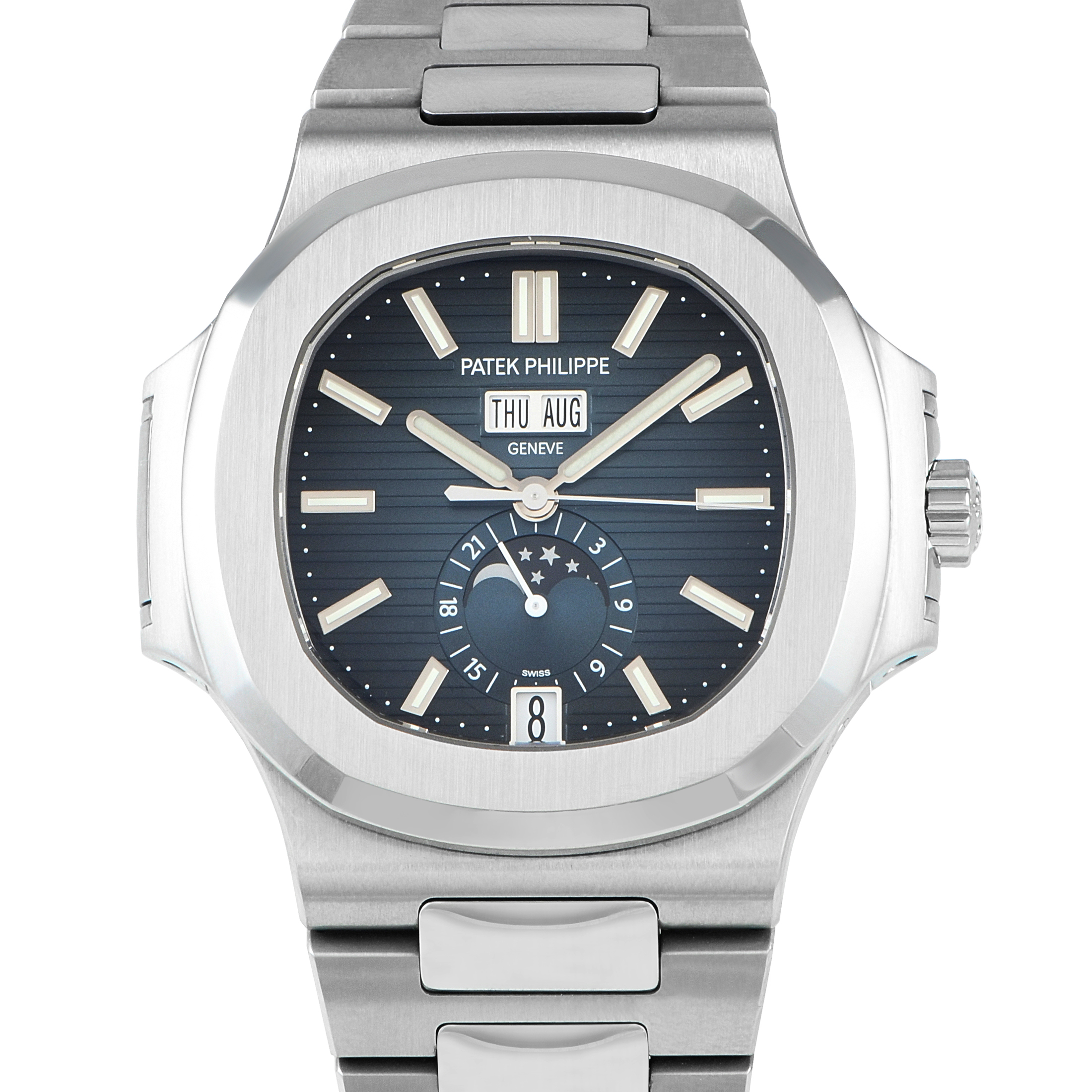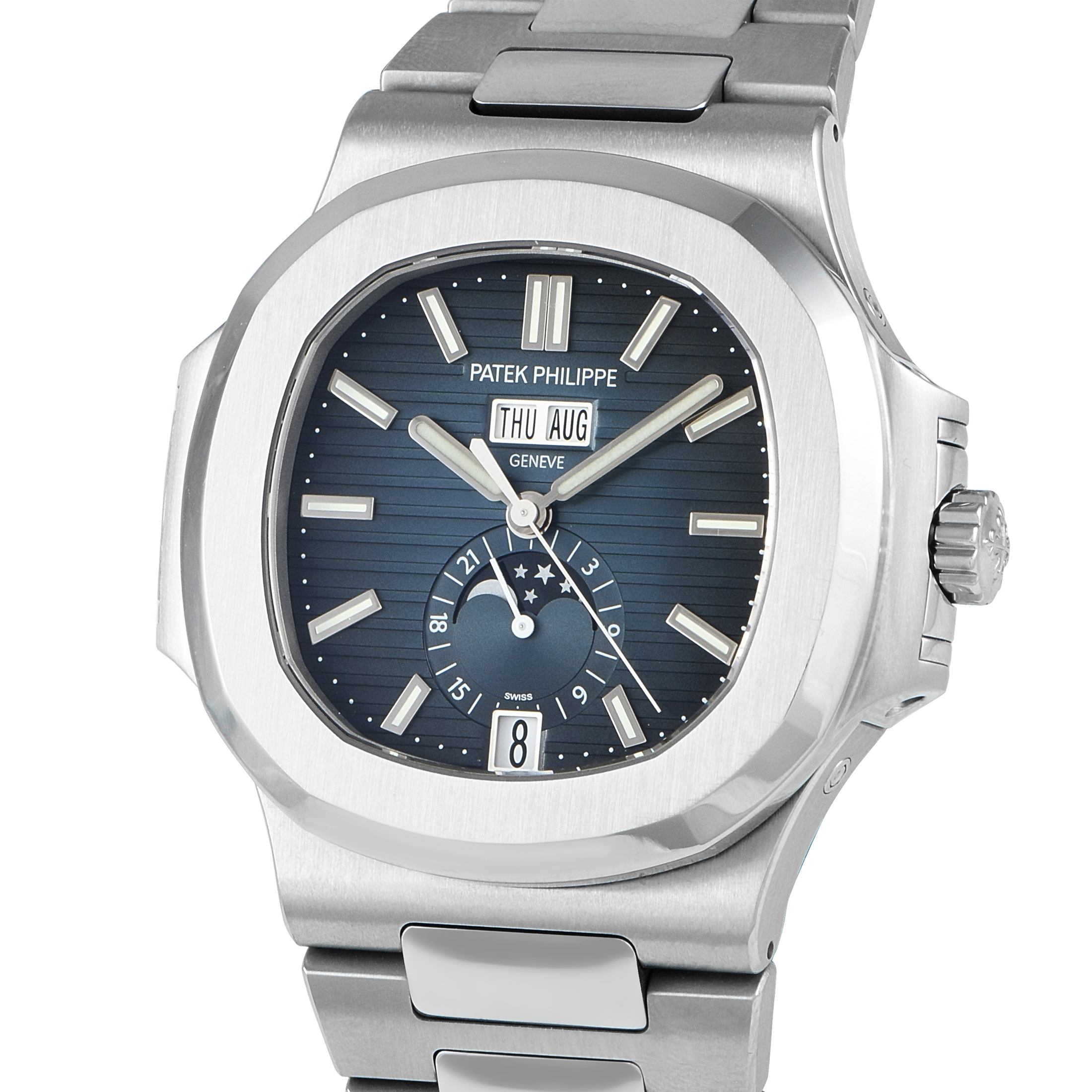 This pre-owned Patek Philippe Nautilus Annual Calendar Moonphase Watch 5726/1A-014 comes with papers and the manufacturer’s box.