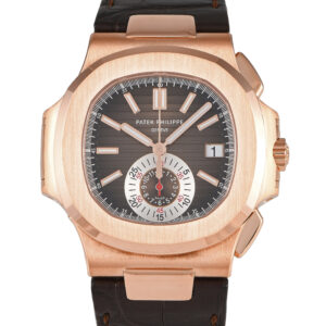The Patek Philippe Nautilus 5980R-001 is a watch that embodies eternal elegance. A favorite of many, this timepiece is beautifully made in 18K rose gold and fitted onto a handstitched brown leather strap. Its horizontally embossed brown dial bears luminous rose gold index hour markers and hands, a date window at 3:00, and a single chronograph counter with three concentric scales at 6. The watch is powered by caliber CH 28-520 C, a self-winding mechanical movement with flyback chronograph function and a 55-hour power reserve.