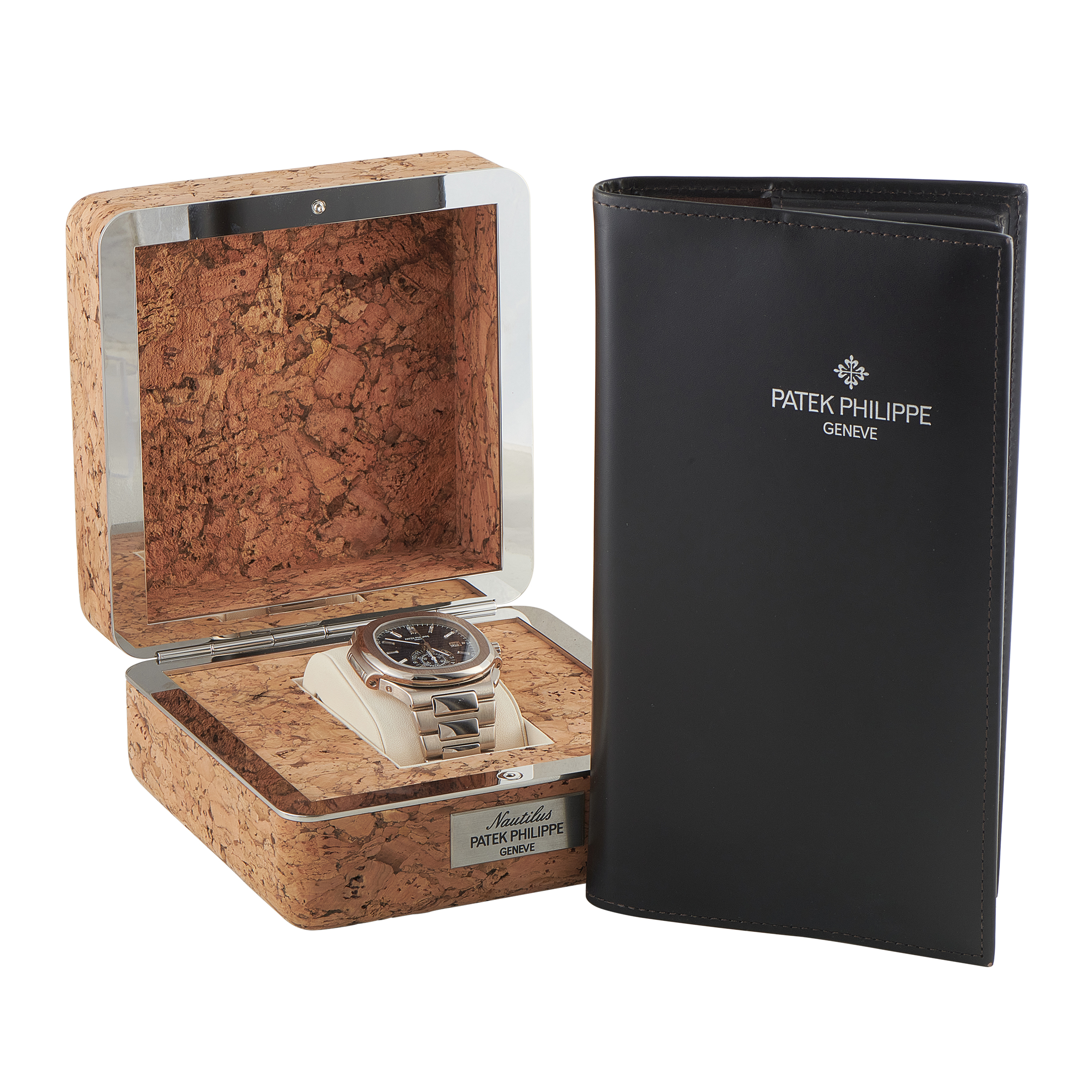 Papers, a leather bifold, and the manufacturer’s box accompany this Patek Philippe Nautilus Chronograph 18K White Gold Limited Edition Watch 5976/1g-001.