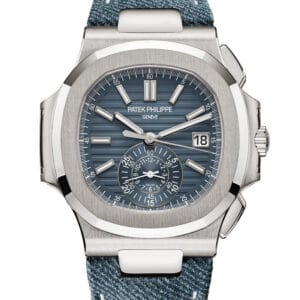 Enhancing its modern appeal, the watch is fitted with a blue-gray calfskin strap featuring a denim pattern, secured by a white gold Nautilus fold-over clasp. An additional blue-gray composite rubber strap with a fabric pattern is also included.