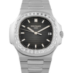 The Patek Philippe Nautilus ref. 5711/110P-001 wears its rarity with authority. Its 40mm platinum case keeps the iconic porthole-inspired Nautilus shape. A bezel set with baguette diamonds frames the dial like a halo. More baguette diamonds, functioning as hour markers, punctuate the horizontally embossed gray dial. Inside the case is the automatic Caliber 26-330 S C, pulsing with steady precision and offering approximately 45 hours of autonomy.