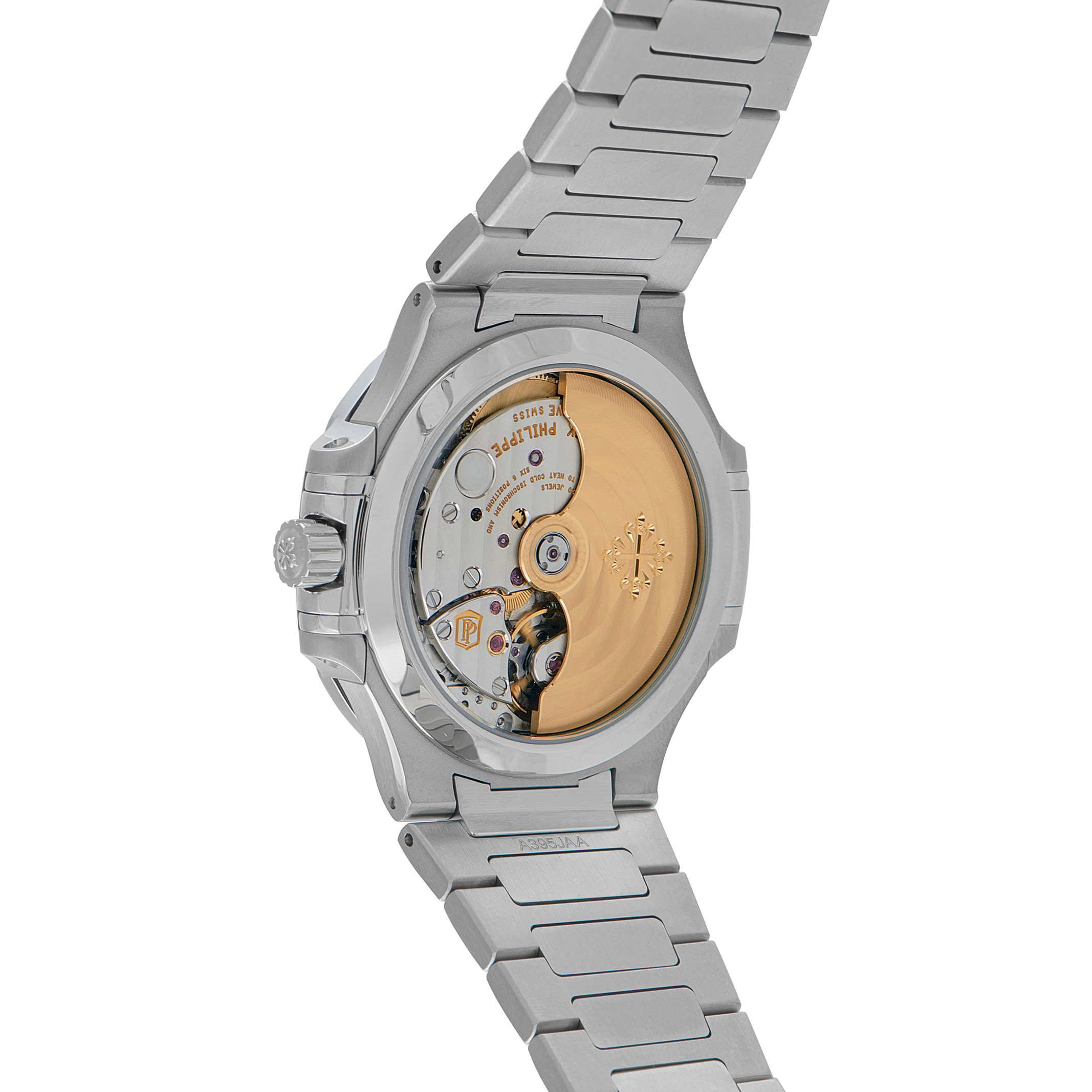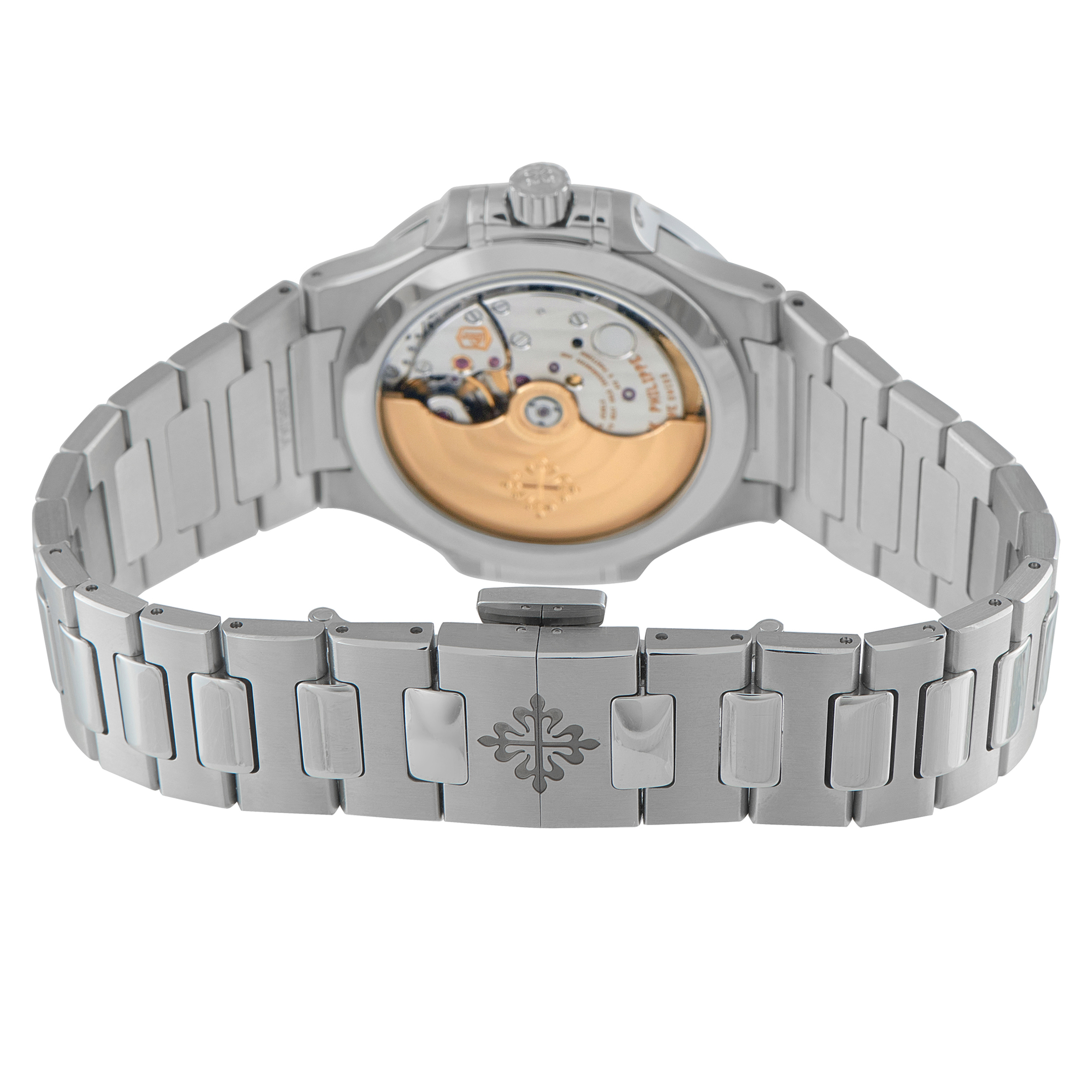 Here is one of the most compelling expressions of the ladies’ Nautilus. The ref. 7118/1200A-001 brings sport lineage into a more compact 35.2mm format, where technical accuracy meets refined finishing. The steel bezel is set with 56 brilliant-cut diamonds, each following the rounded octagonal contour. A blue opaline dial with a gentle “wave” pattern features luminous hands and hour markers, with an Arabic numeral 12 and date window at 6. Inside runs caliber 26-330 S C, a self-winding movement visible through the sapphire caseback.