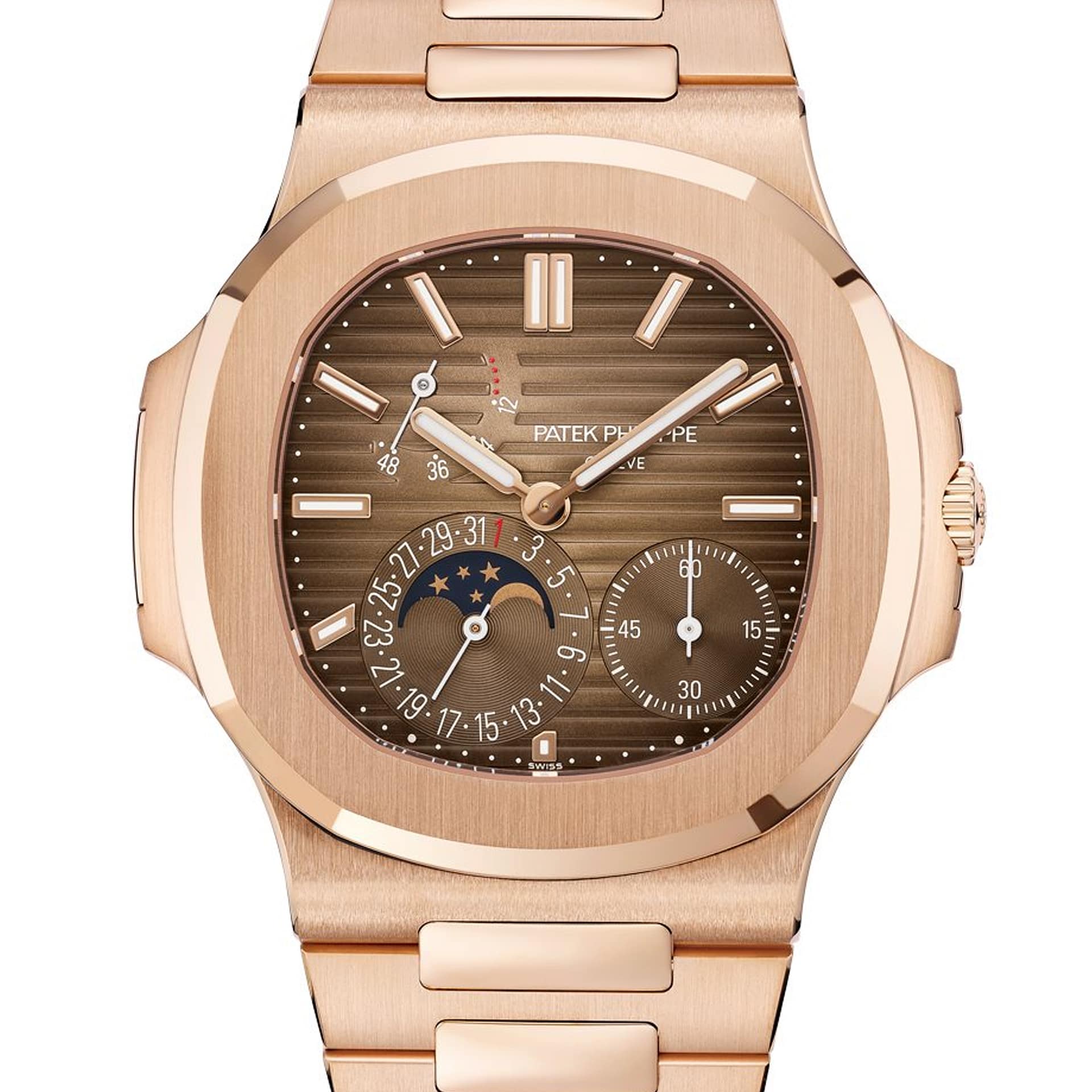 The Patek Philippe Nautilus Moon Phase 5712/1R-001 elevates the iconic Nautilus design by incorporating intricate complications within a luxurious rose gold framework. Crafted from 18k rose gold, the 40mm case is home to a brown sunburst embossed dial that darkens towards the edges.