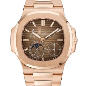 The Patek Philippe Nautilus Moon Phase 5712/1R-001 elevates the iconic Nautilus design by incorporating intricate complications within a luxurious rose gold framework. Crafted from 18k rose gold, the 40mm case is home to a brown sunburst embossed dial that darkens towards the edges.