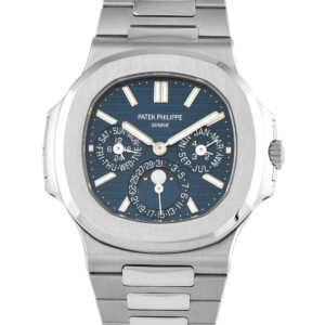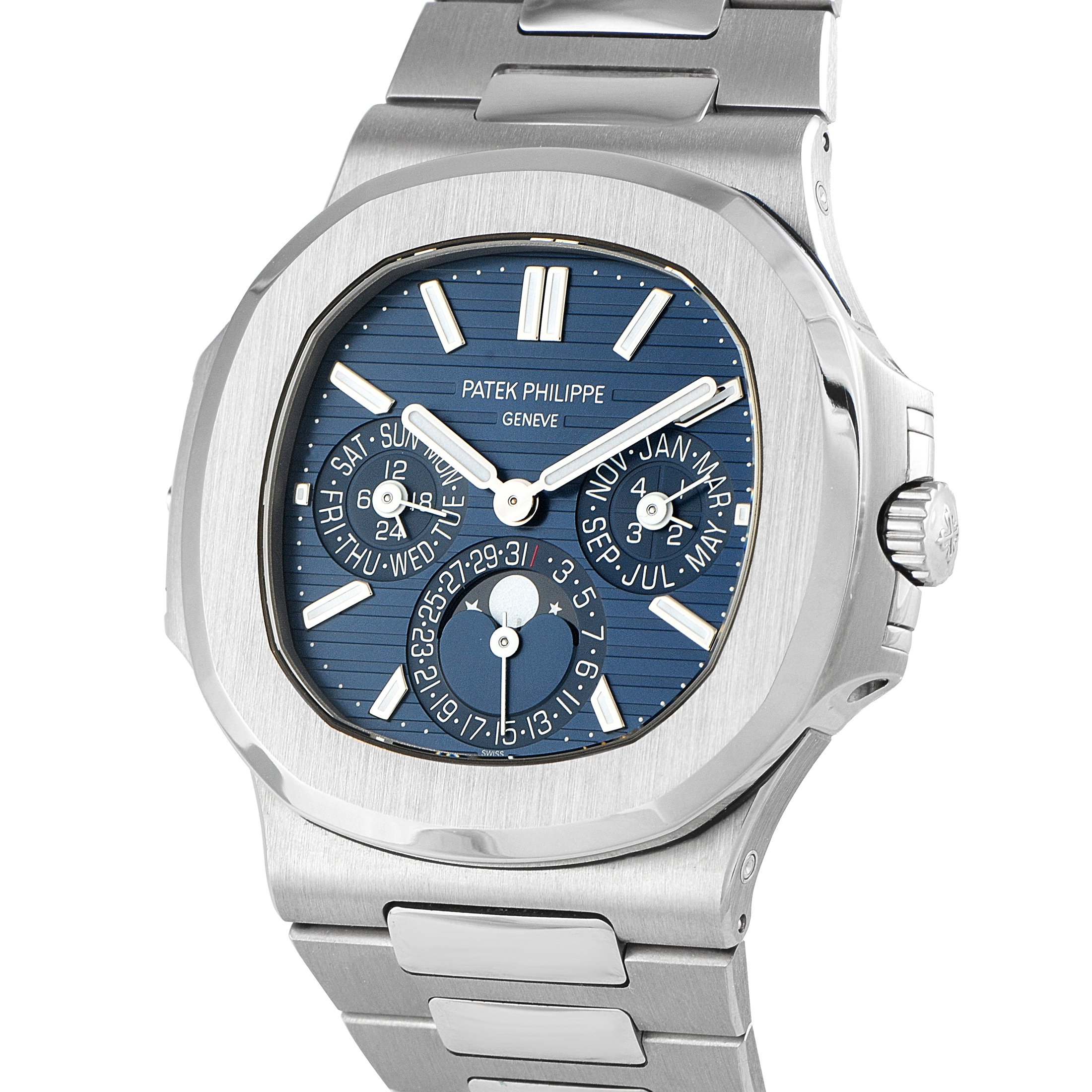 The Patek Philippe ref. 5740/1G-001 delivers a statement of refined taste. This slim Nautilus features a perpetual calendar complication packaged in full 18K white gold. Its 40mm cushion-shaped case houses the renowned ultra-thin self-winding Caliber 240 Q, displaying the day, date, month, leap year, 24-hour indication, and moon phase on a horizontally embossed blue dial. This watch is fitted with a matching white gold bracelet.