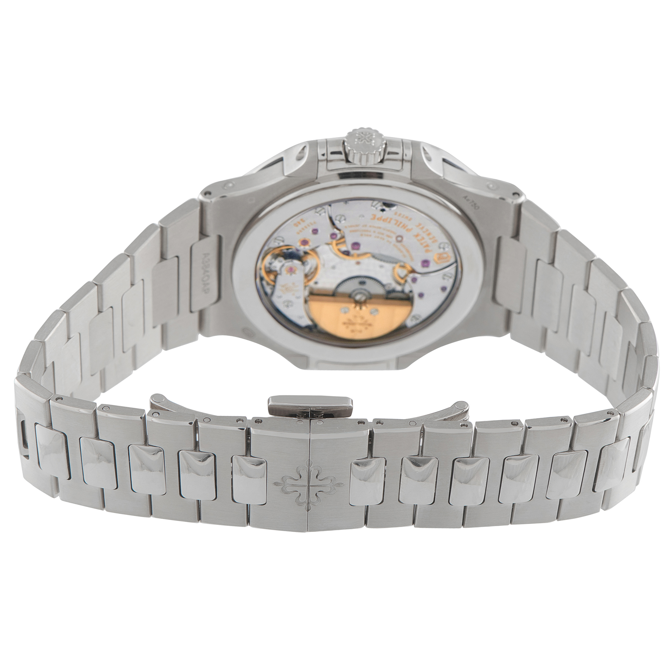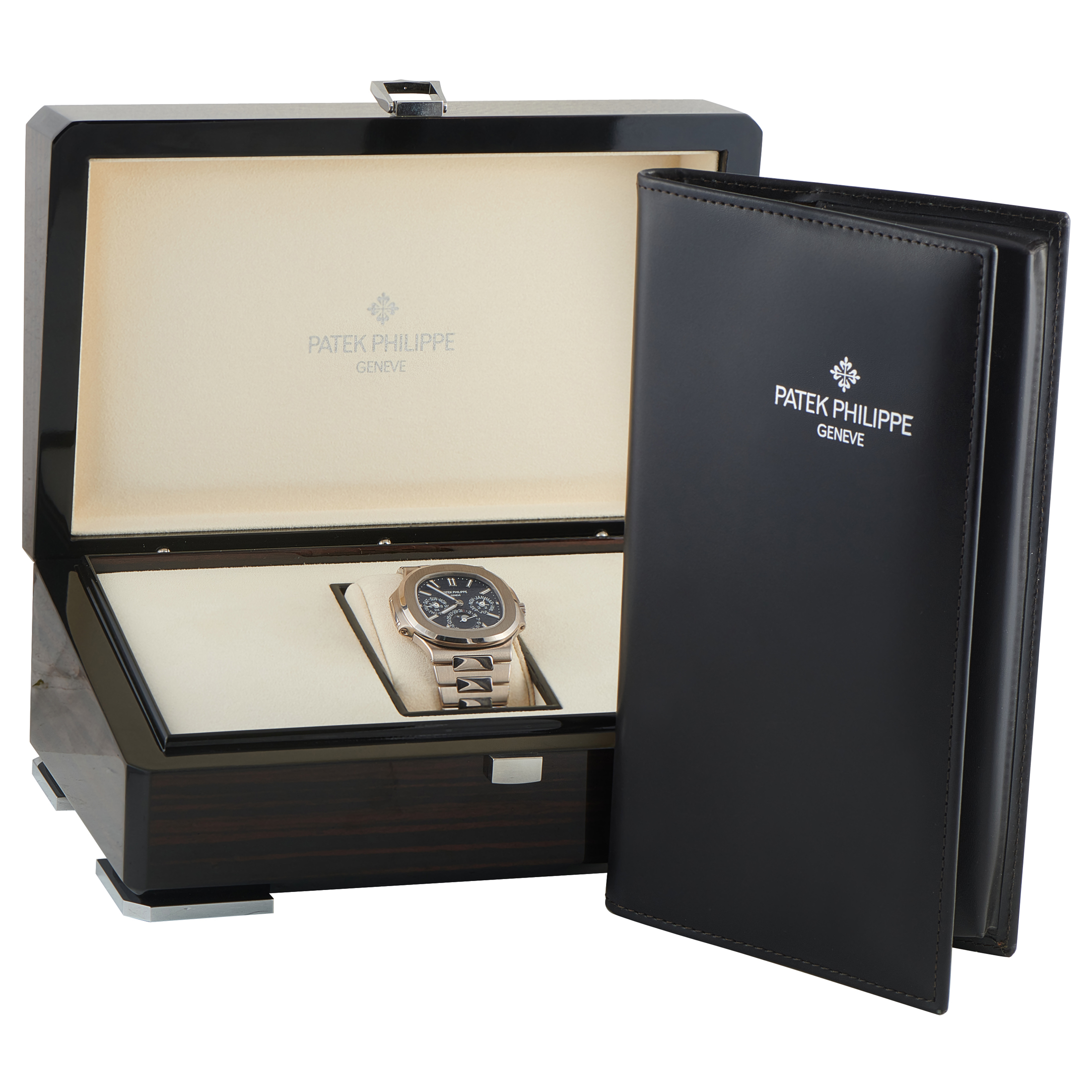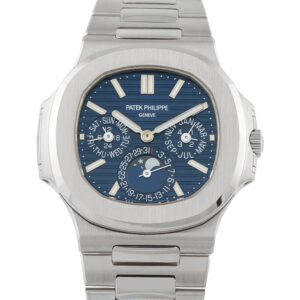 This is a pre-owned Patek Philippe Nautilus Perpetual Calendar 18K White Gold Watch 5740/1G-001. It includes papers and the manufacturer’s box.