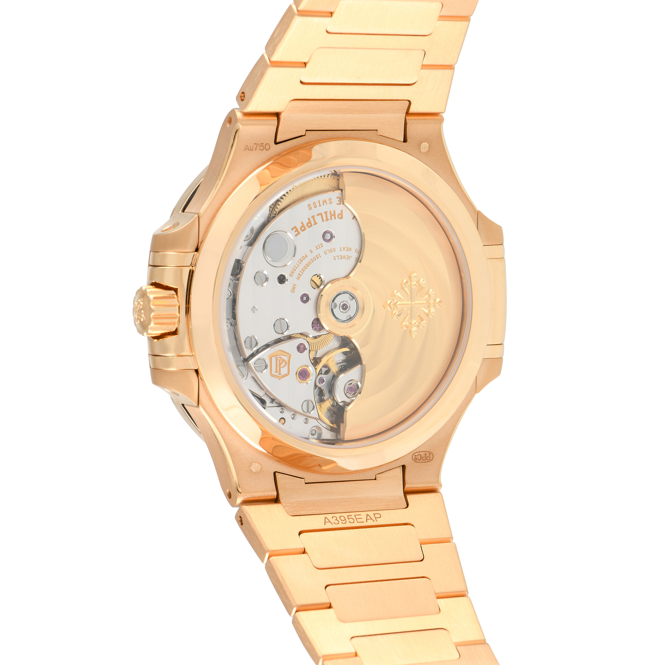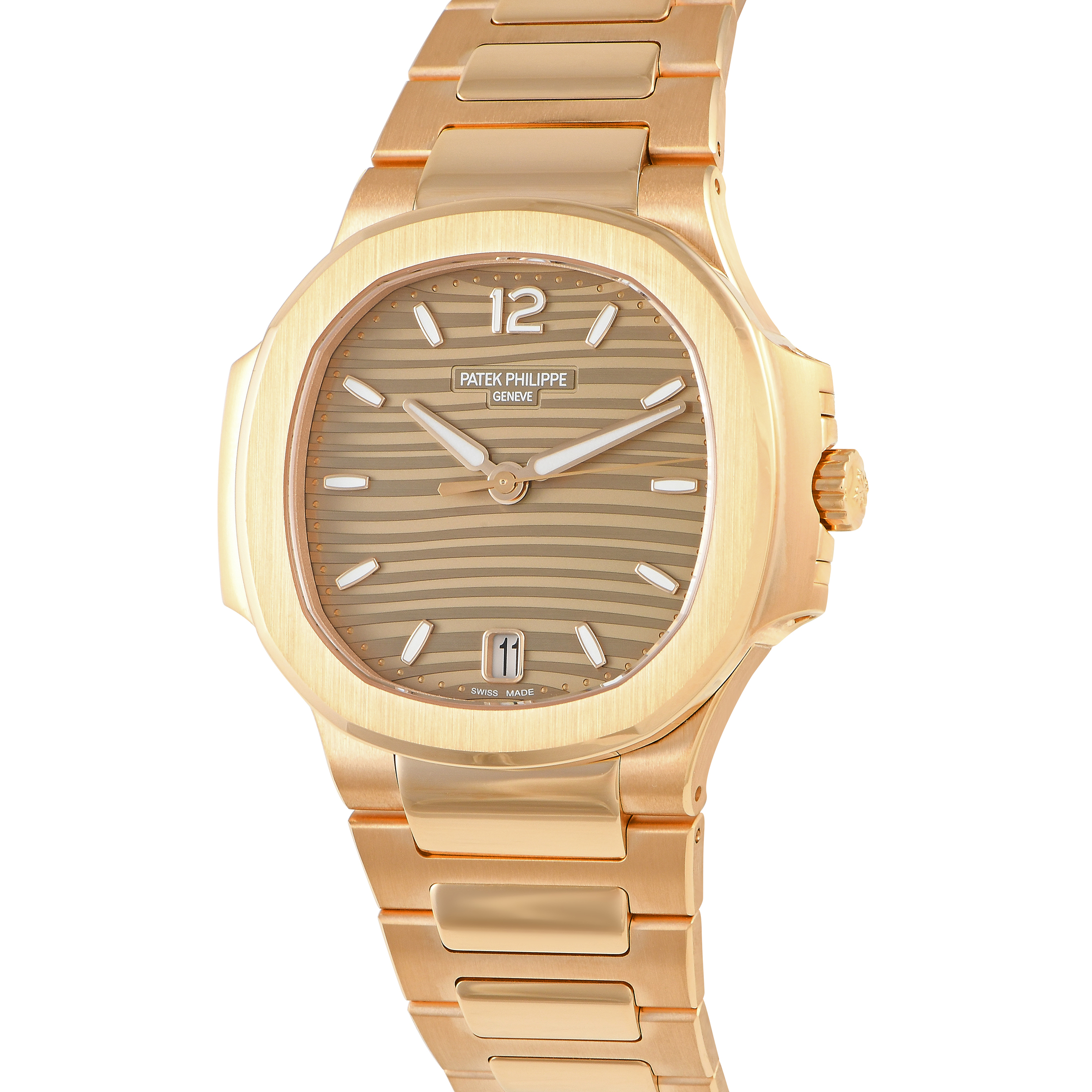 The ladies’ Nautilus ref.7118/1R-010 presents a look that is classy, refined, and interesting all at once. The rose gold case is modestly sized at 35.2mm, with a thickness of 8.62mm. It has a golden brown opaline dial with the signature Nautilus wave pattern. The applied gold hour markers and the gold hands are luminescent. This timepiece utilizes the accurate and reliable Patek Philippe caliber 26‑330 S C. This self-winding mechanical movement with date offers 45 hours of power reserve. A sapphire case back offers a wonderful view of the movement. Rounding out the attractive look of this watch is a rose gold bracelet in brushed-polished finish.