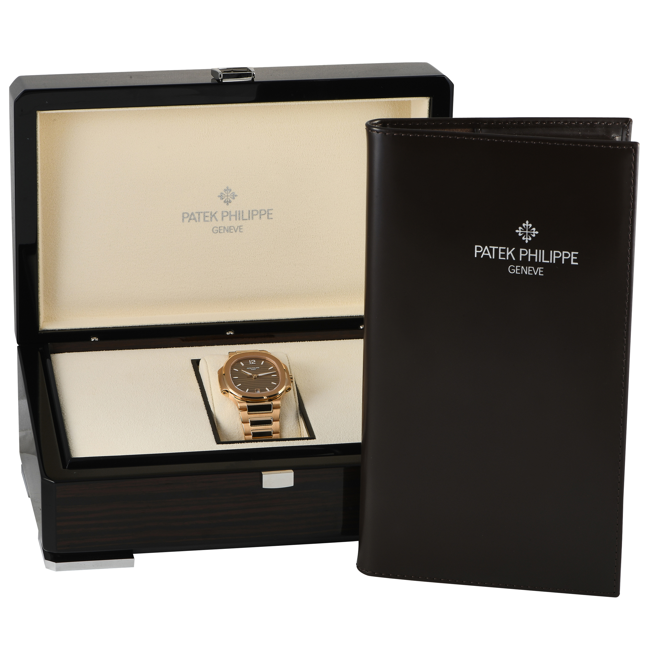 This unworn Patek Philippe Nautilus Brown Opaline 18K Rose Gold Ladies Watch 7118/1R-010 is accompanied by papers and the manufacturer’s box.