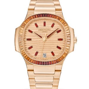 The Patek Philippe Nautilus 7118/1300R-001 elegantly combines the iconic design of the Nautilus collection with exquisite gem-setting artistry. Crafted from 18k rose gold, the case measures 35.2 mm in diameter and has a height of 8.62 mm, offering a refined presence on the wrist.